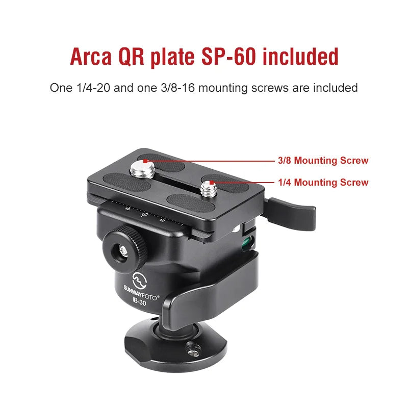 Arca QR plate SP-60 is included and comes with two screws of 1/4-20 and 3/8-16 standards each.