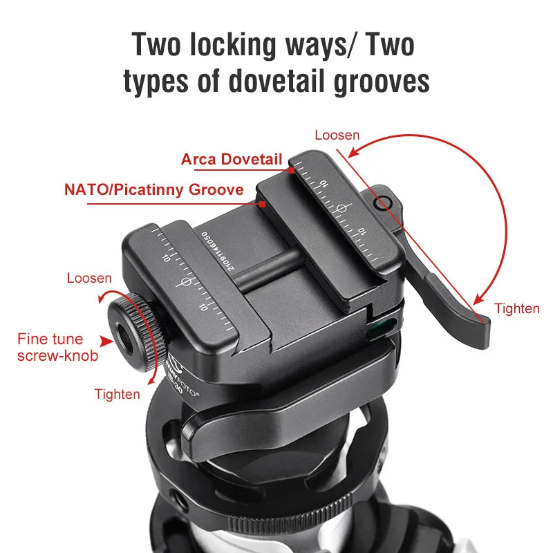 Adjustable clamp width; compatible with Arca/RRS and NATO/Picatinny dovetail grooves. The anti-slip block effectively prevents loaded equipment from dropping under powerful shock.