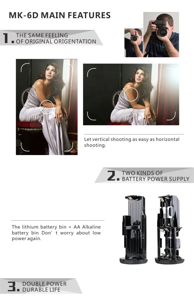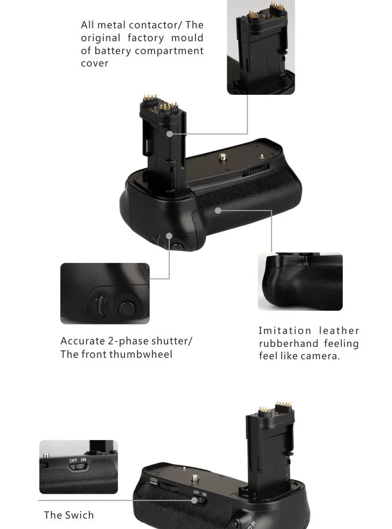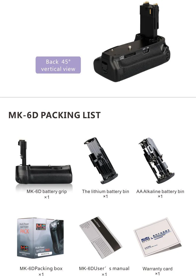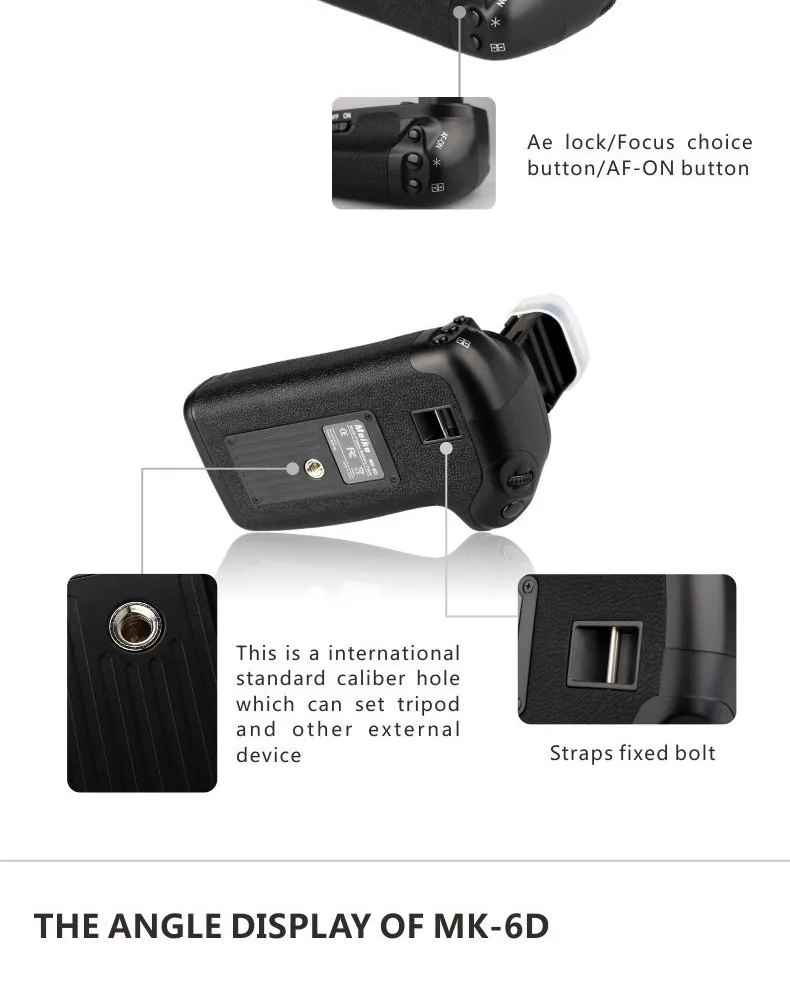 This Multi-Power Battery Pack is used for Canon 6D Camera only, has the same functions as the original grip BG-E13. It holds up to two LP-E6 battery packs or six AA Batteries, offering double-length shooting time.