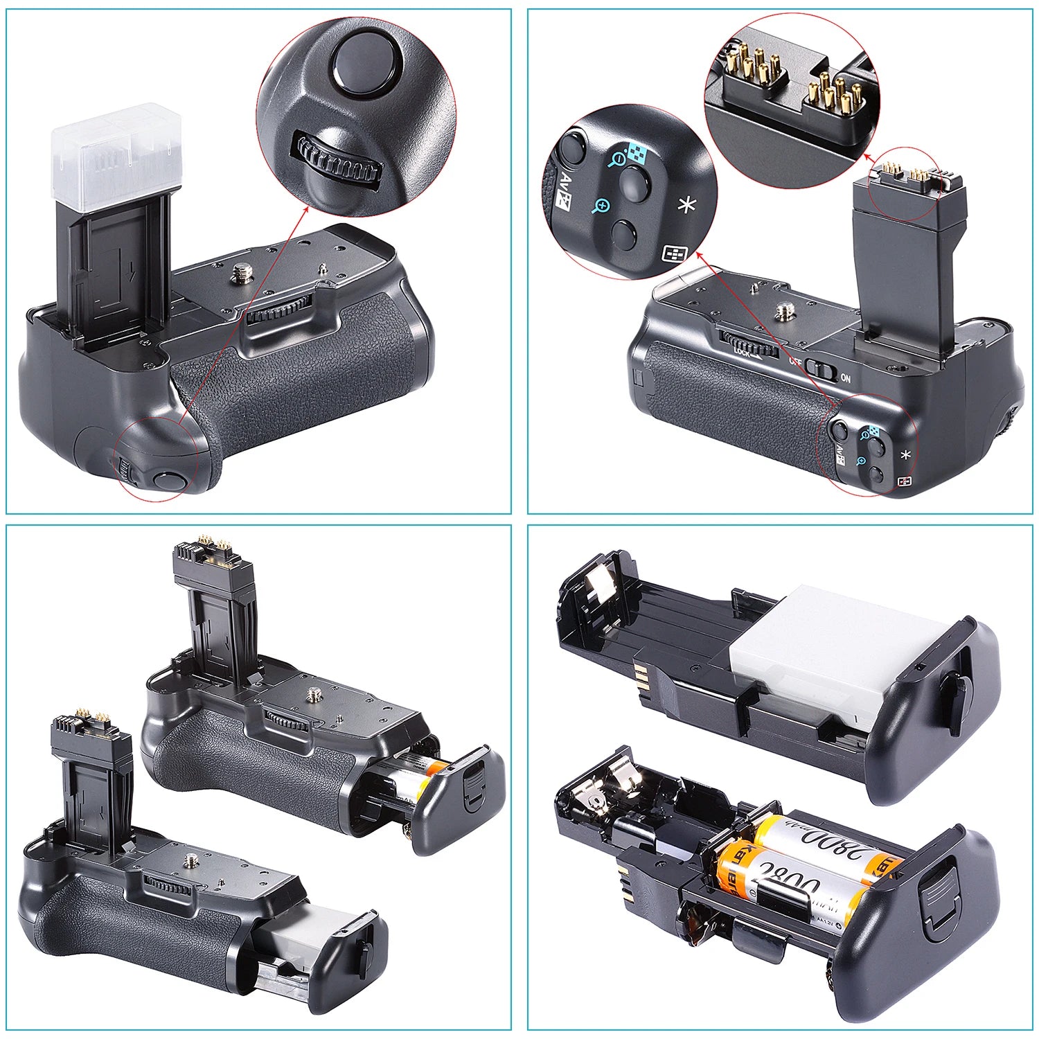 It provides additional battery space, one for standard Canon battery and one more for AAs. In addition to the camera’s internal battery, accepts one Canon LP-E8 Replacement rechargeable battery or six AA batteries (alkaline, Ni-MH, lithium, or nickel-manganese) can be used instead for added convenience. (Note: ONLY LP-E8 replacement Battery is included, all other compatible batteries are sold separately)