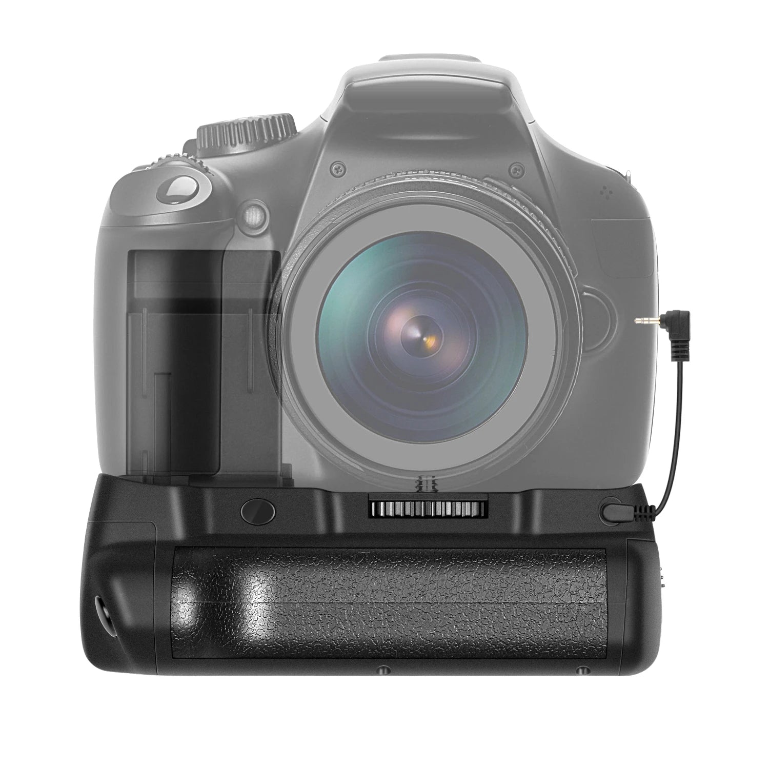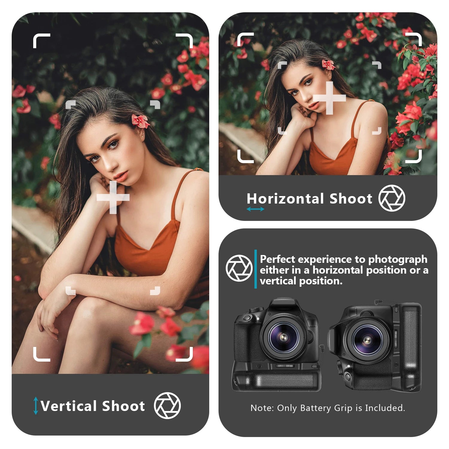VERTICAL BATTERY GRIP: For Canon EOS 1100D / 1200D / Rebel T3 / Rebel T5 / Rebel T6; Providing room for an additional battery, effectively doubles your shooting time, which helps ensure you never run out of power