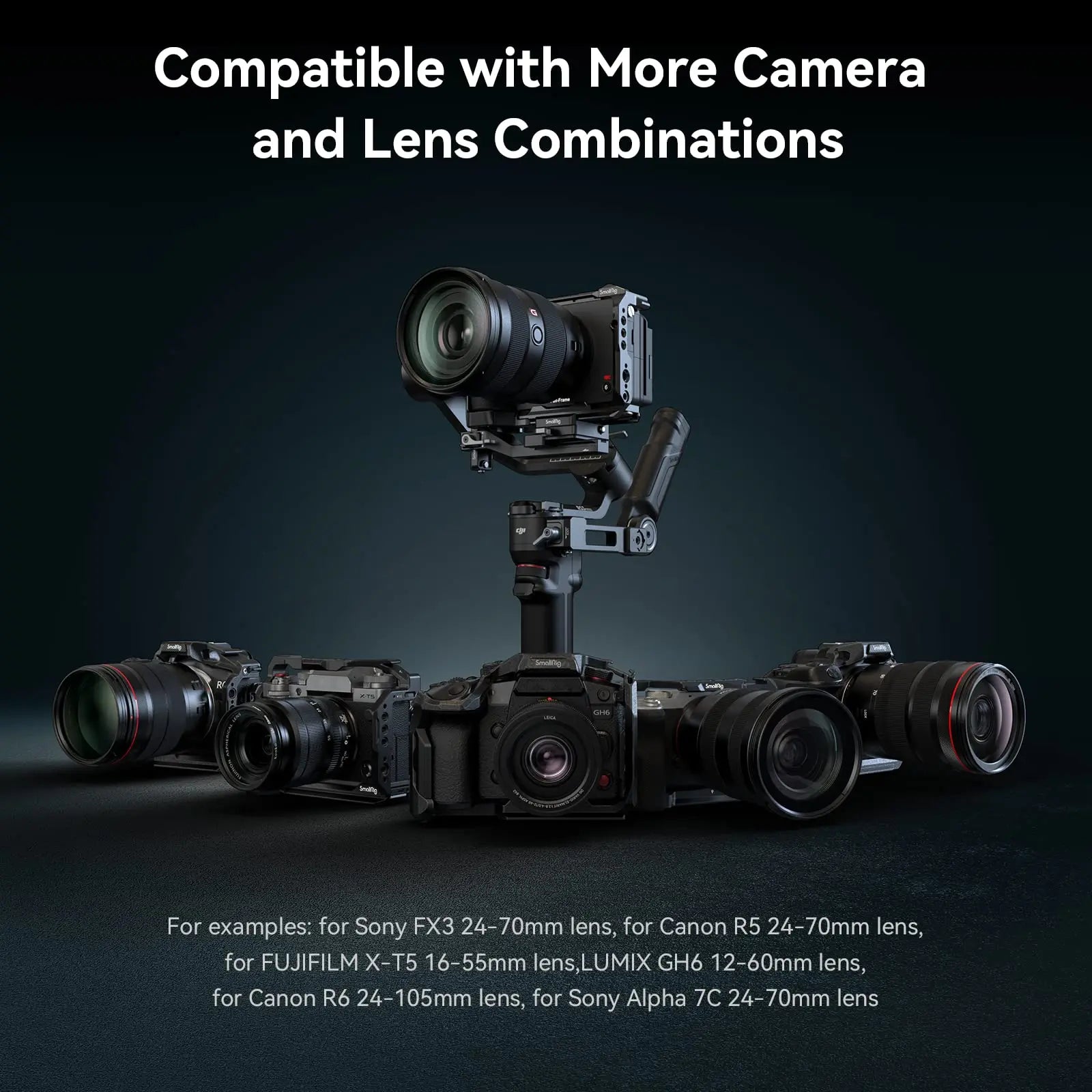SmallRig Arca-Swiss Mount Plate for DJI RS 3 Mini 4195 is designed to support various other cameras, such as Sony FX3 with 24-70mm lens, Canon R5 with 24-70mm lens, FUJIFILM X-T5 with 16-55mm lens and LUMIX GH6 with 12-60mm lens. They can be mounted by sliding in from side or top. The rig also helps quickly switch between vertical and horizontal shooting.