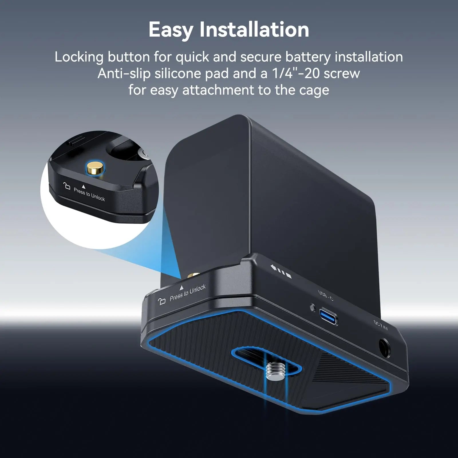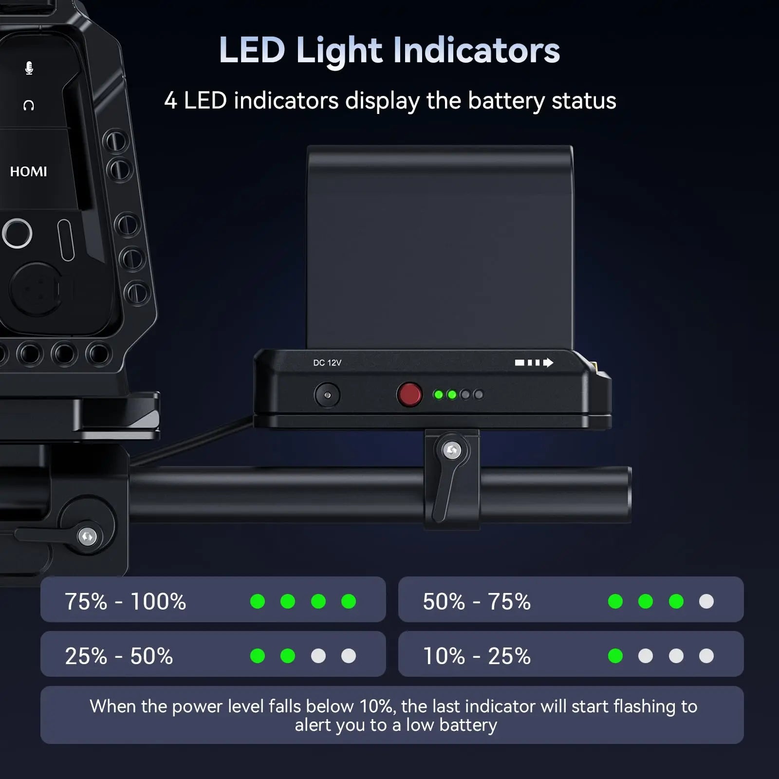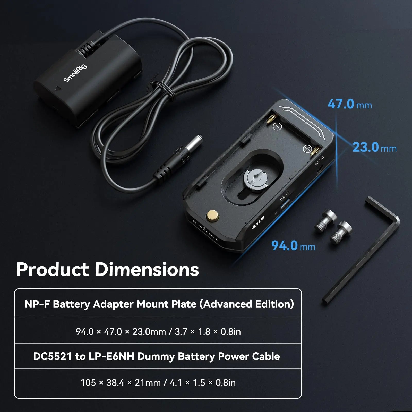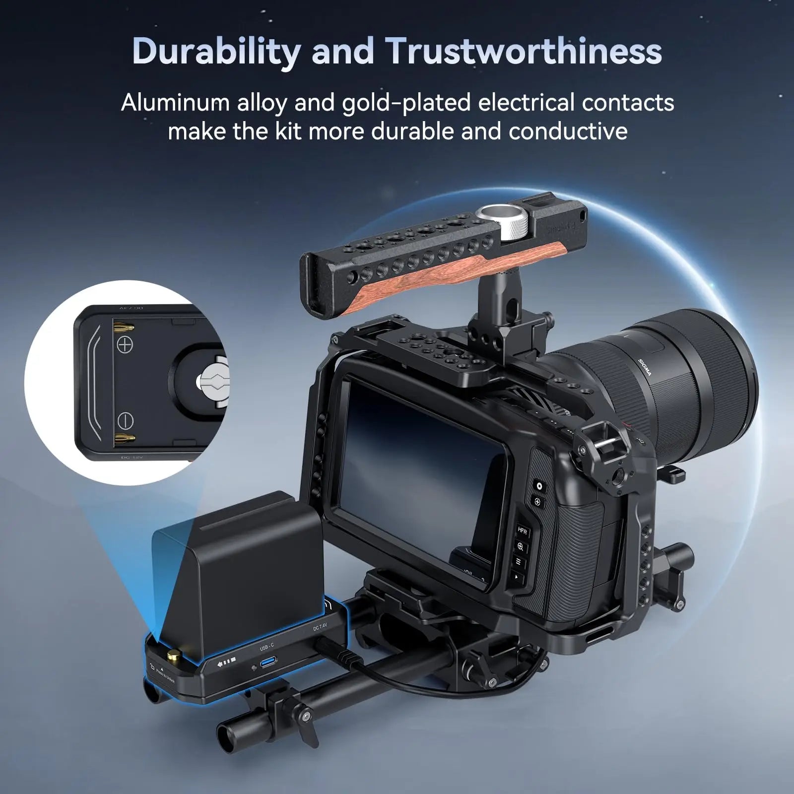 SmallRig NP-F Battery Adapter Mount Plate Kit for Canon EOS R5 / R5C and BMPCC 4K / 6K (Advanced Edition) 4340 is designed to enable NP-F batteries on the market (including Sony original and third-party batteries) to power BMPCC 4K/6K, Canon R5 C, and various mirrorless cameras, the set can achieve long-lasting power supply. The NP-F Battery Plate is made of aluminum alloy with gold-plated electrical contacts to be more durable and conductive. The plate has a self-locking button for quick and secure battery installation and a 1/4''-20 threaded hole for easy attachment to the cage. There are 36W 7.4V / 12V DC output on its sides and a 36W USB-C port, which can output current or charge an NP-F battery. All ports have short circuit protection and automatic wake-up and sleep functions. In addition, this item features LED lights indicating USB charging and discharging state, battery connection, and battery life.