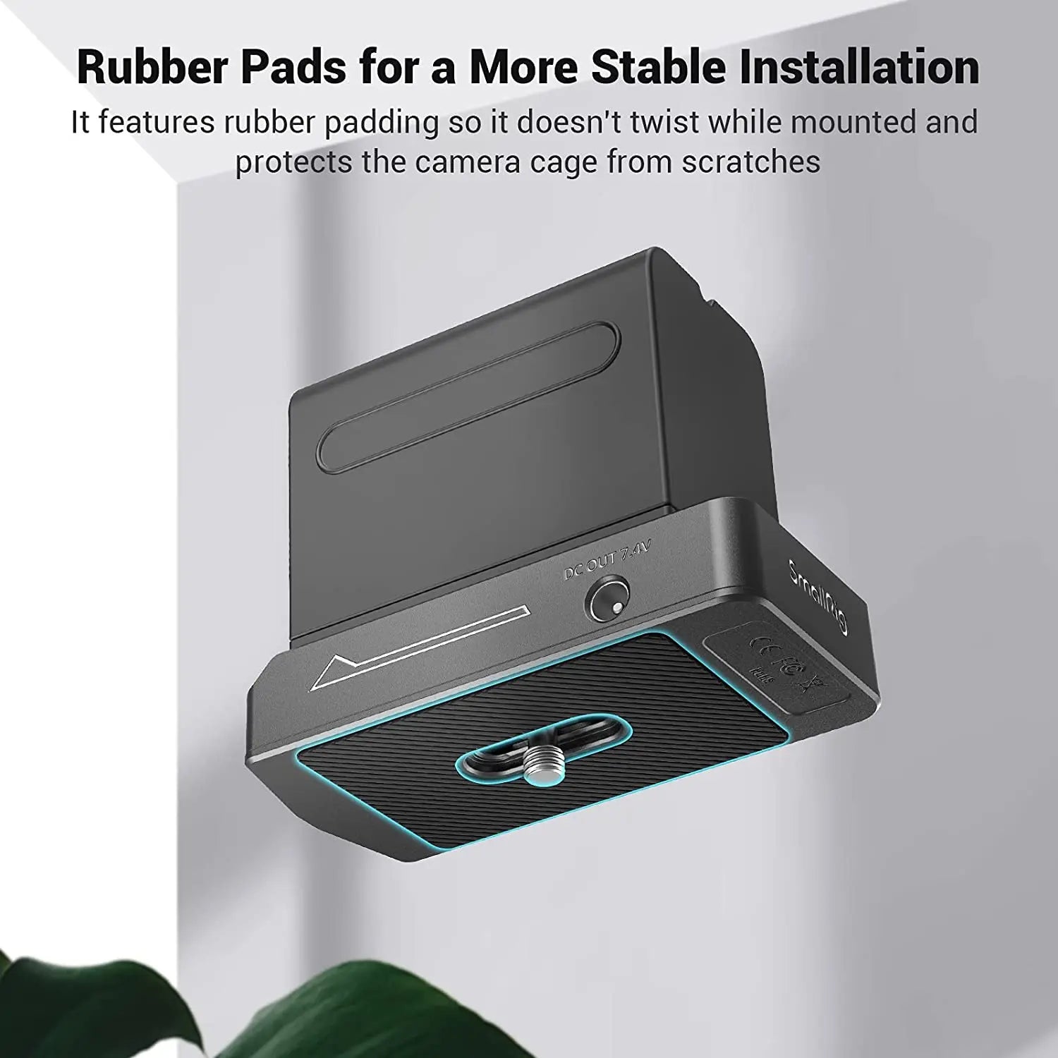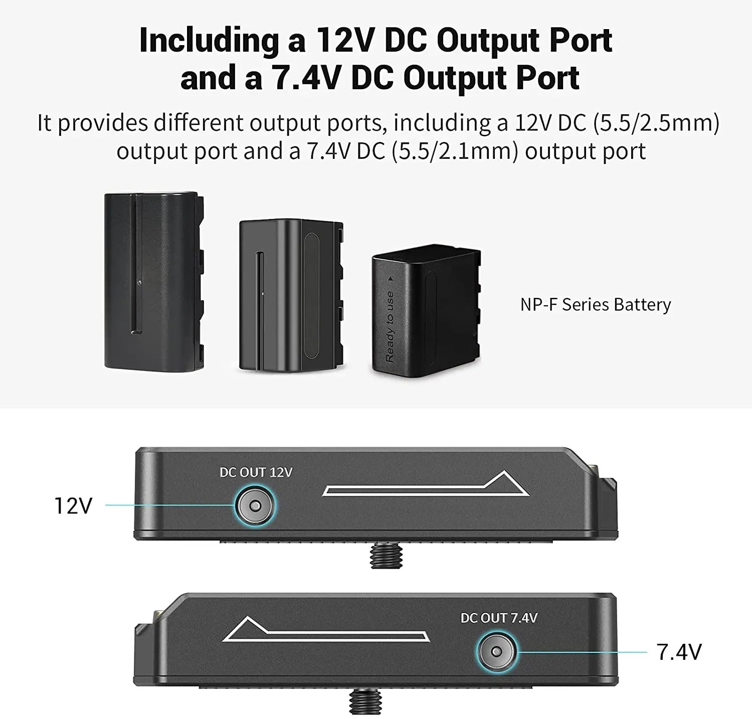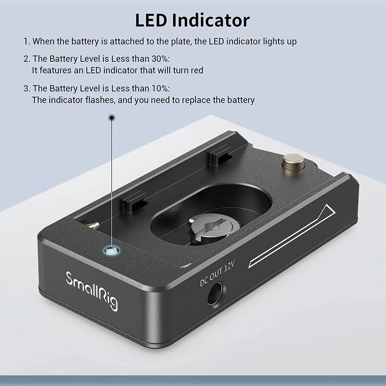 SmallRig NP-F Battery Adapter Plate Lite 3018is designed to provide greater battery life for your camera rig via a Sony NP-F battery. It provides different output ports, including a 12V DC (5.5/2.5mm) output port and a 7.4V DC (5.5/2.1mm) output port. It features an LED indicator that will turn red when the battery level is less than 30 percent. When the indicator flashes, it means the battery level is less than 10 percent, and you need to replace the battery. The plate features a rubber pad on the bottom for a more stable installation.