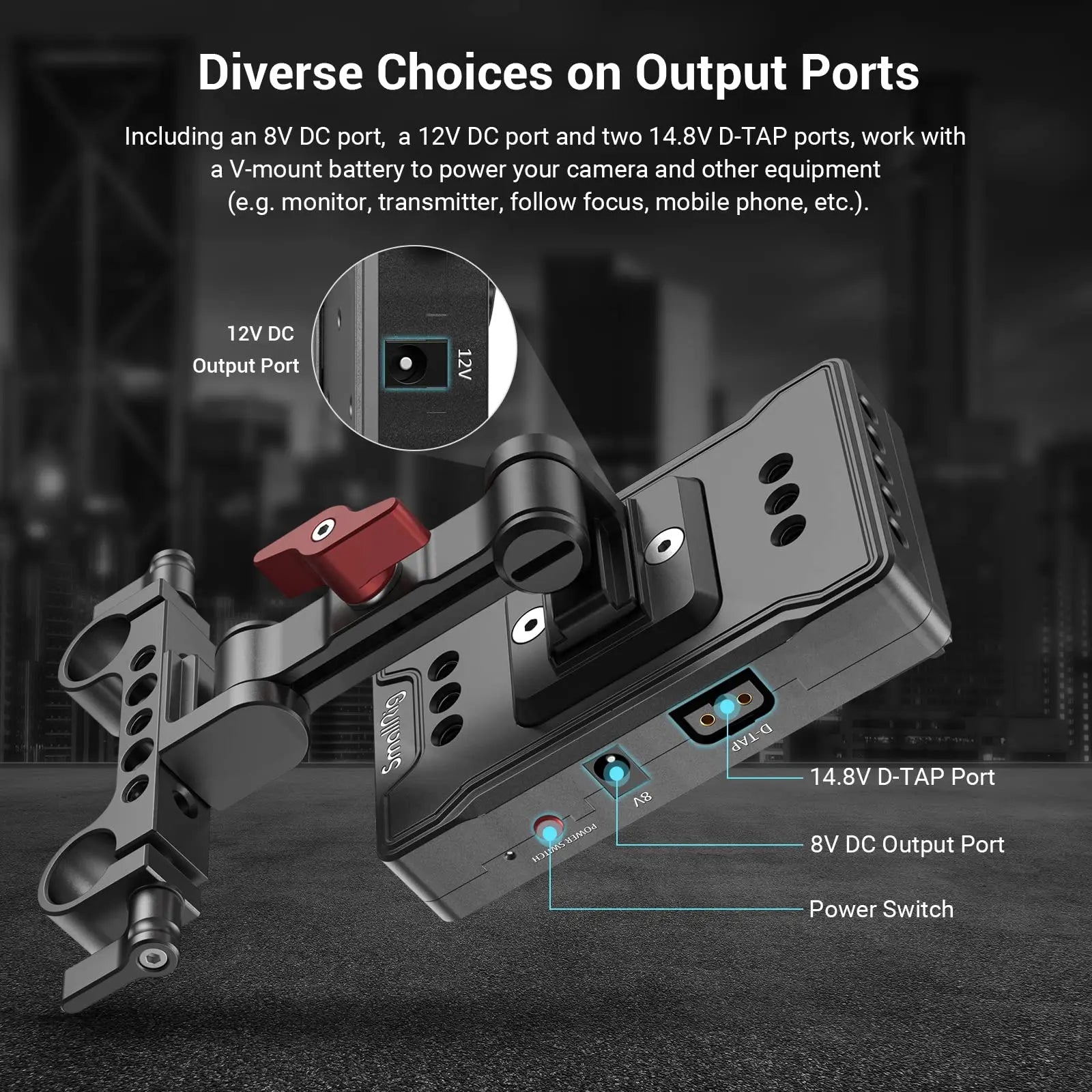 SmallRig V Mount Battery Adapter Plate (Basic Version) with Extension Arm 3499 is designed to provide greater battery life to your camera rig via a V mount battery. Its standard quick-lock V mount supports most V mount batteries. Output ports, including an 8V DC port, a 12V DC port, and two 14.8V D-Tap ports, work with a V mount battery to power your camera and other equipment (e.g. monitor, transmitter, follow focus, mobile phone, etc.). It features a power switch that controls all of the output ports more quickly and conveniently and comes with a 15mm dual rod clamp with an adjustable extension arm that suits a 15mm rail support system and can quickly reposition the battery adapter plate. In addition, multiple 1/4”-20 thread holes allow attaching other accessories such as super clamp mount and magic arm.