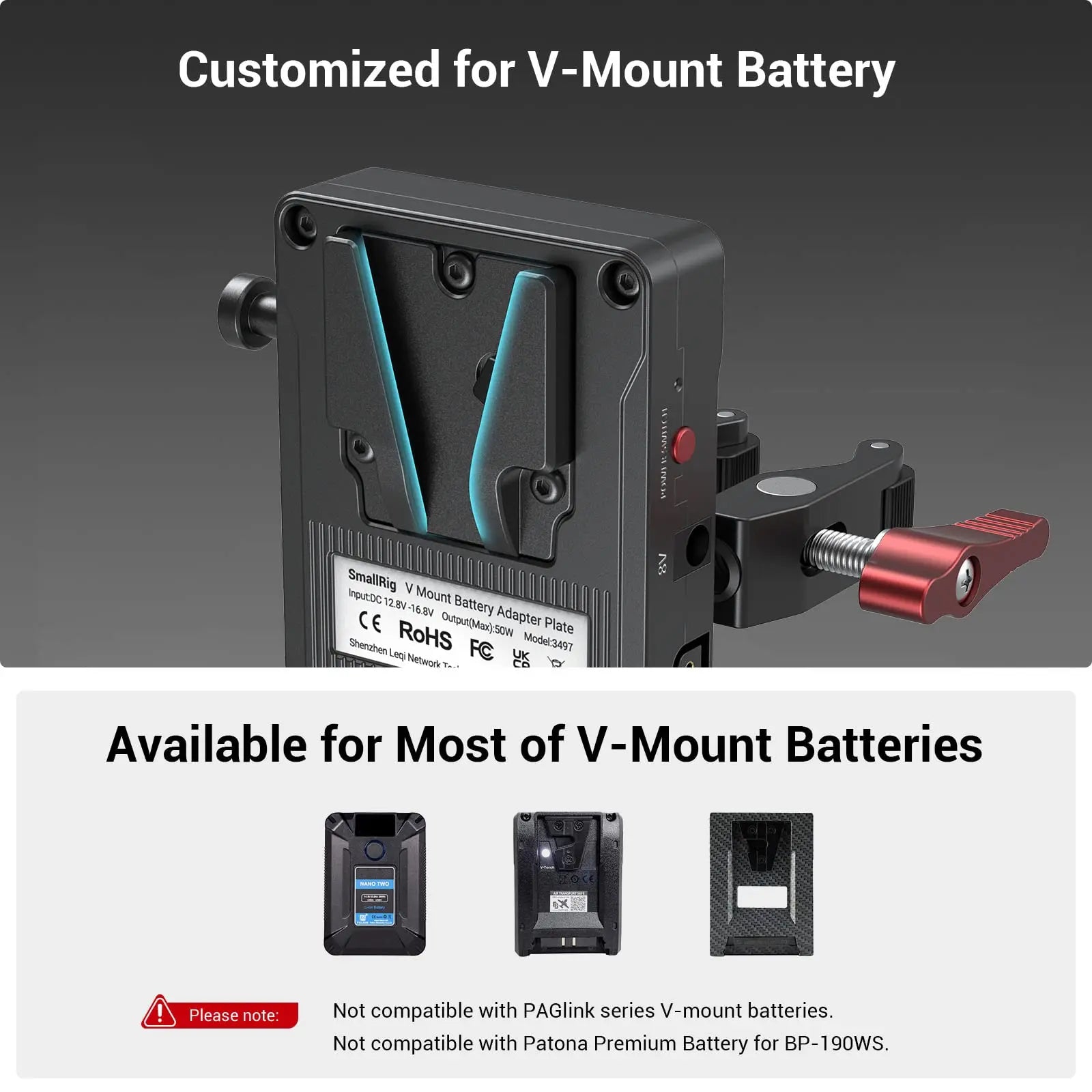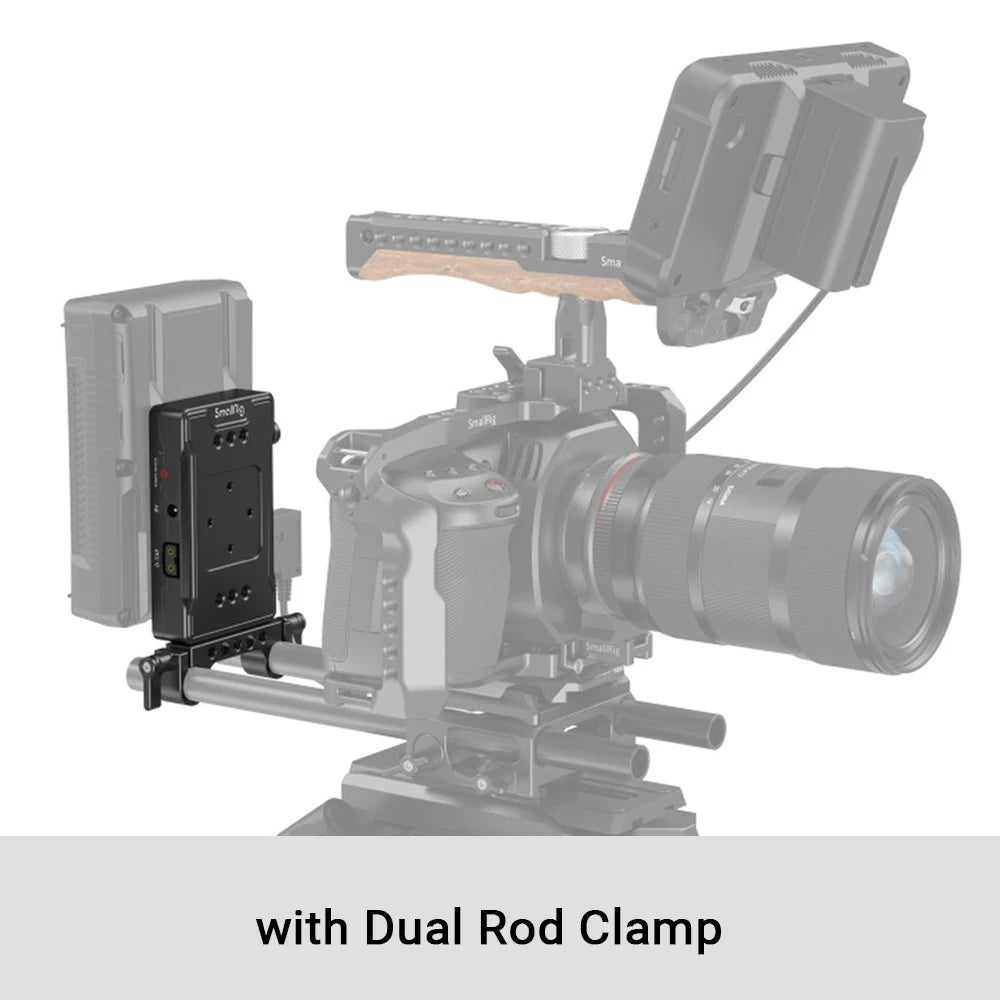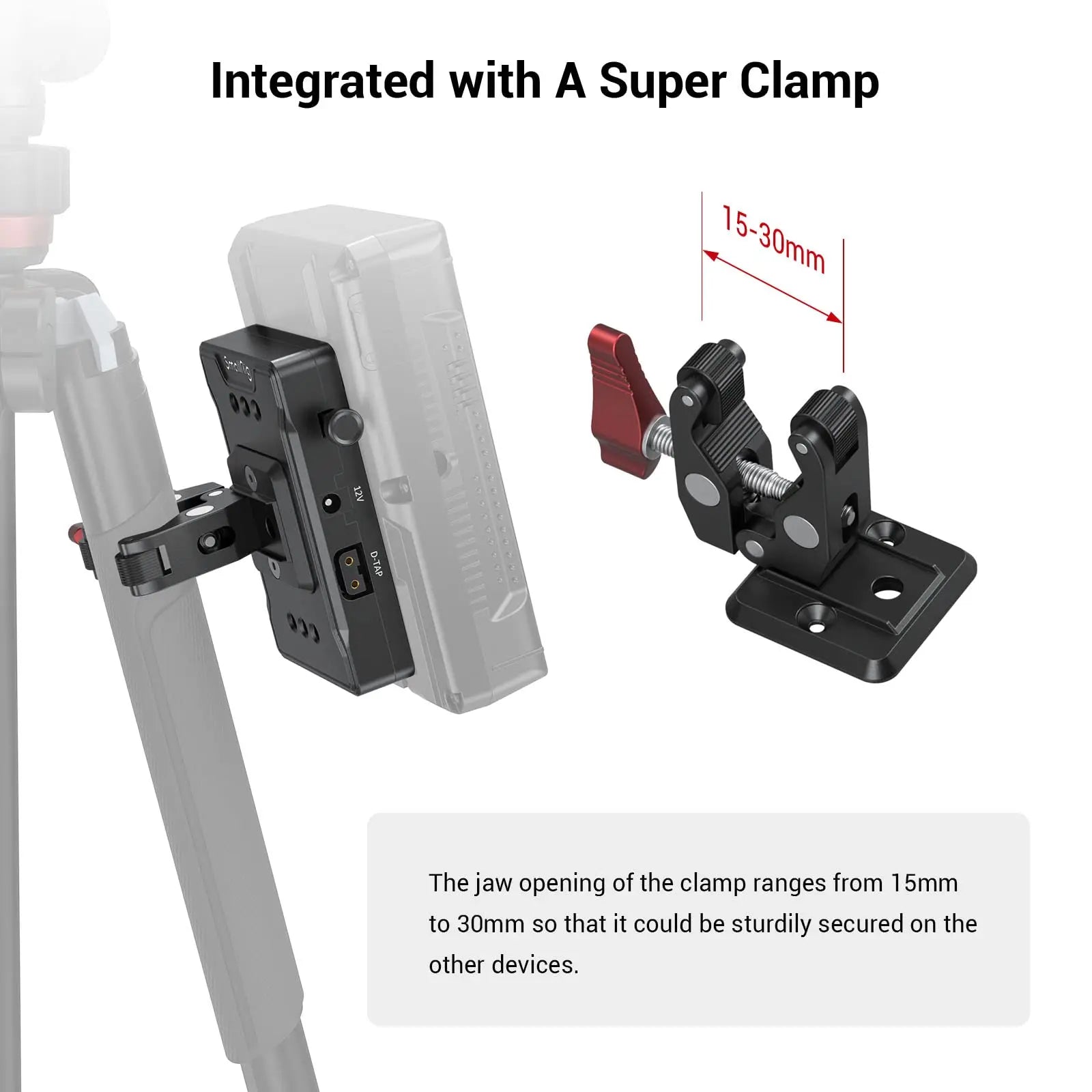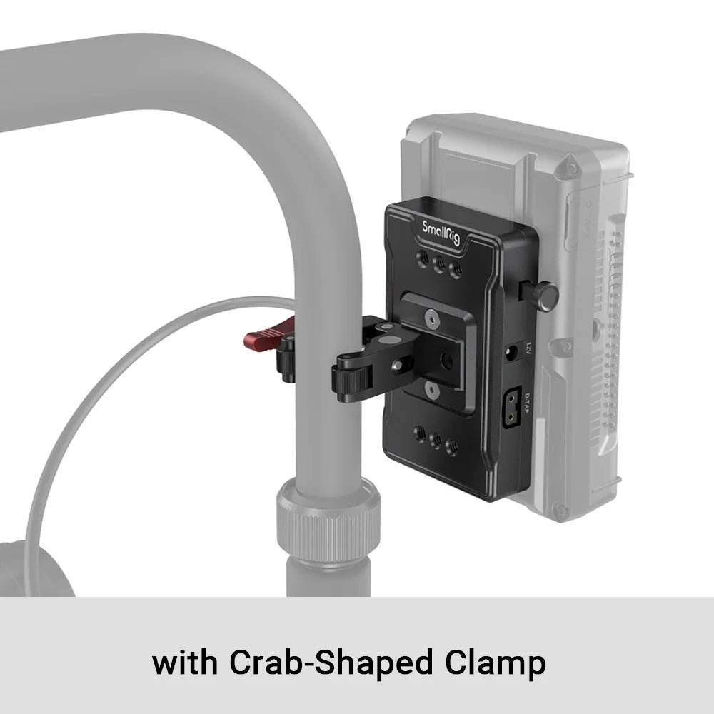 SmallRig V Mount Battery Adapter Plate (Basic Version) with Crab-Shaped Clamp 3497 is designed to provide greater battery life to your camera rig via a V mount battery. Its standard quick-lock V mount supports most V mount batteries. Output ports, including an 8V DC port, a 12V DC port, and two 14.8V D-Tap ports, work with a V mount battery to power your camera and other equipment (e.g. monitor, transmitter, follow focus, mobile phone, etc.). It features a power switch that controls all of the output ports more quickly and conveniently and comes with a super clamp mount that fits rod diameter from 15mm to 30mm to help mount a V mount battery to a tripod, a light stand, or a handheld ring for gimbals. In addition, multiple 1/4”-20 thread holes allow attaching other accessories such as dual rod clamp and magic arm.