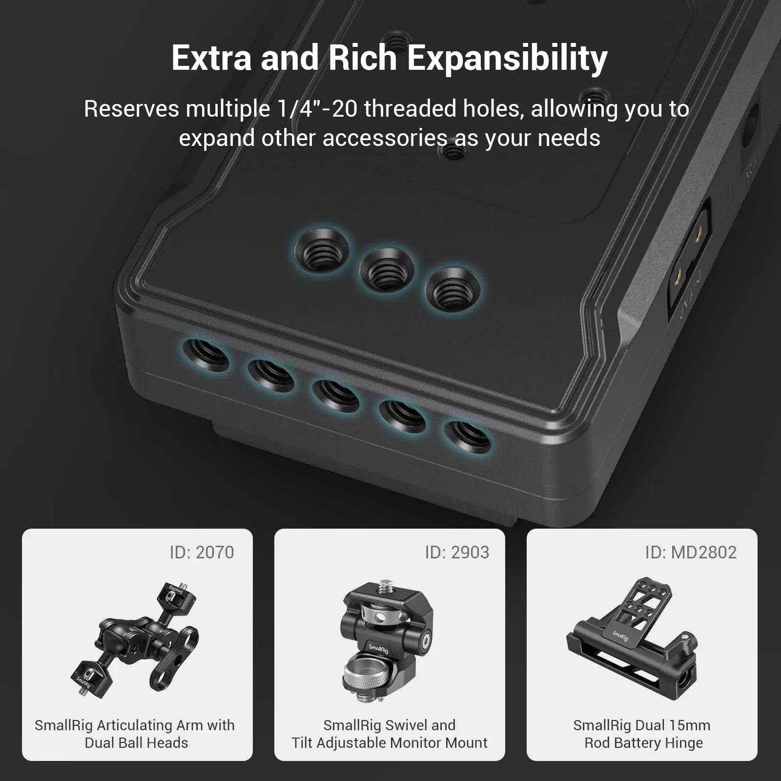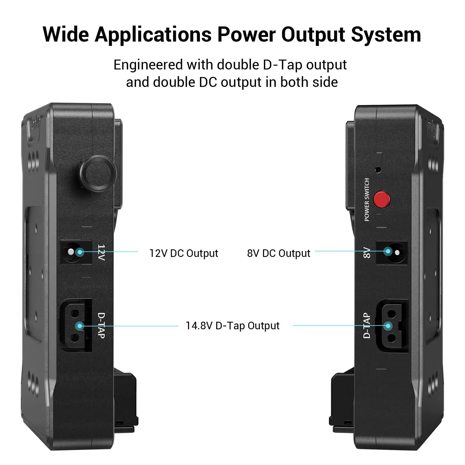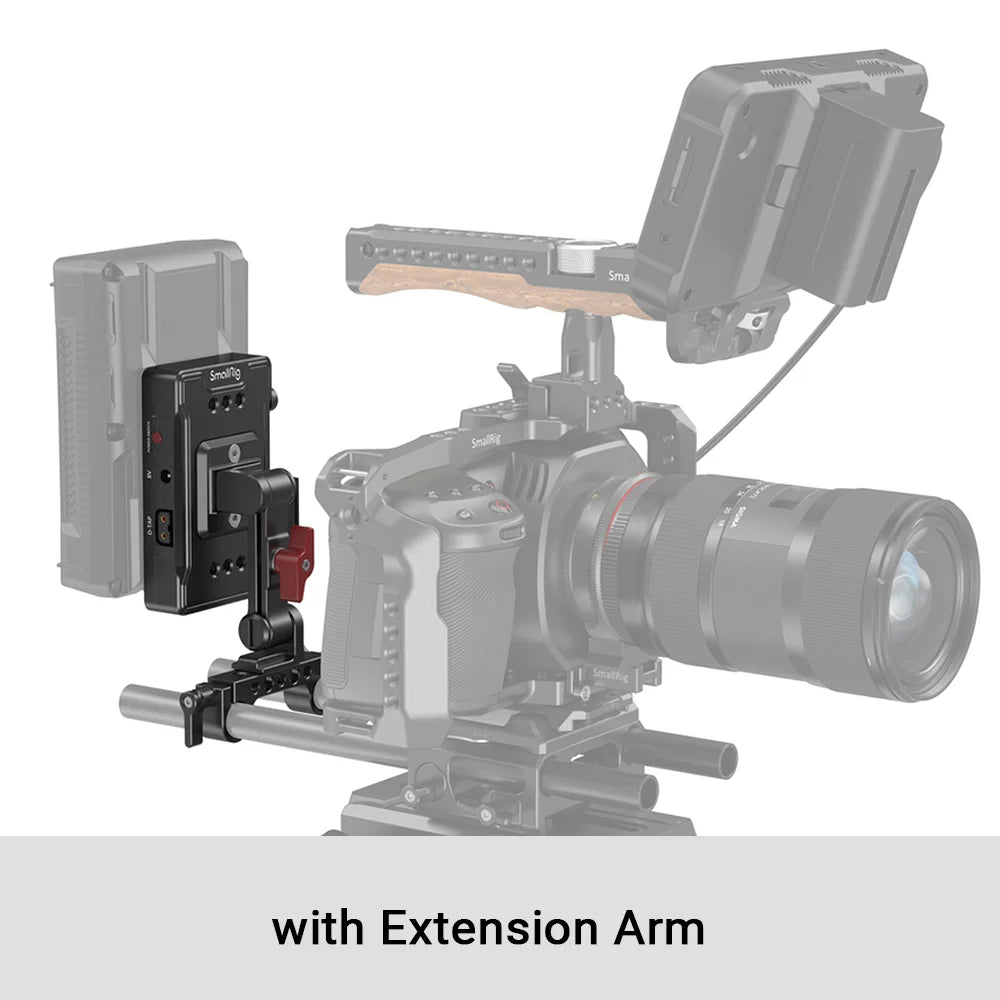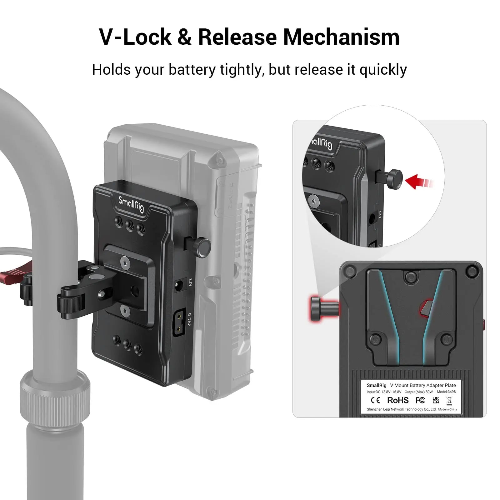 SmallRig V Mount Battery Adapter Plate (Basic Version) with Crab-Shaped Clamp 3497 is designed to provide greater battery life to your camera rig via a V mount battery. Its standard quick-lock V mount supports most V mount batteries. Output ports, including an 8V DC port, a 12V DC port, and two 14.8V D-Tap ports, work with a V mount battery to power your camera and other equipment (e.g. monitor, transmitter, follow focus, mobile phone, etc.). It features a power switch that controls all of the output ports more quickly and conveniently and comes with a super clamp mount that fits rod diameter from 15mm to 30mm to help mount a V mount battery to a tripod, a light stand, or a handheld ring for gimbals. In addition, multiple 1/4”-20 thread holes allow attaching other accessories such as dual rod clamp and magic arm.