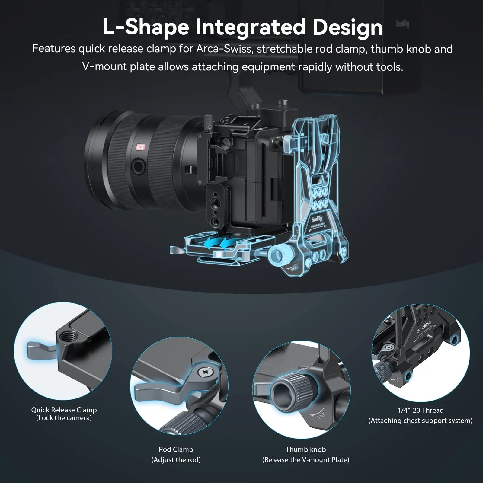1. Compact, lightweight, all-in-one mounting solution to V-mount battery