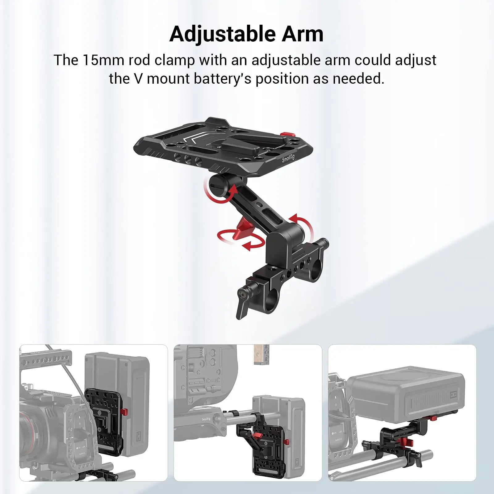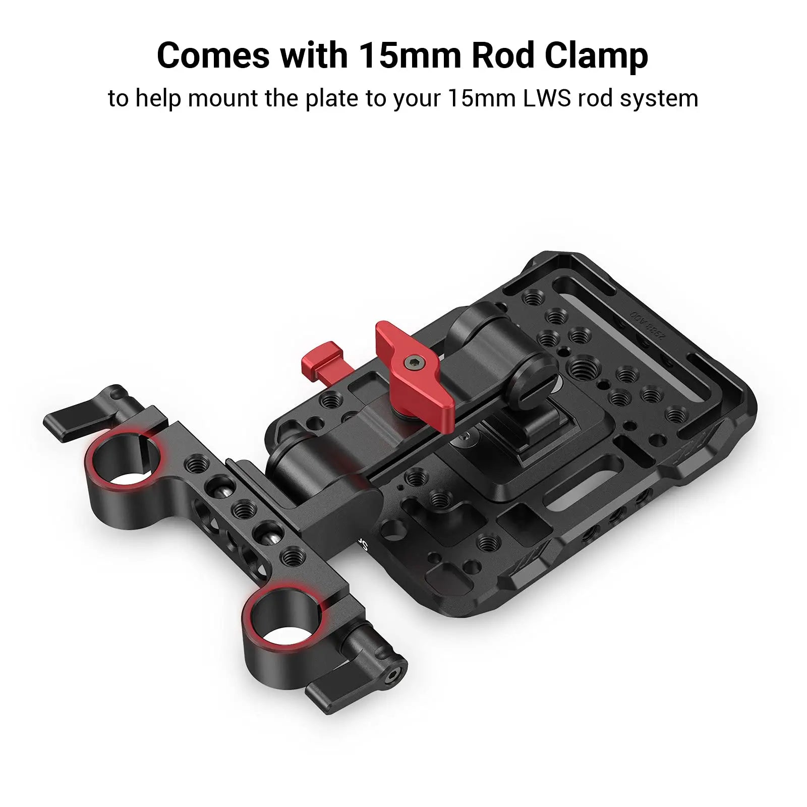 3. It comes with a dual 15mm rod clamp with an adjustable arm to help mount the plate to your 15mm LWS rod system and adjust the V mount battery's position as needed.