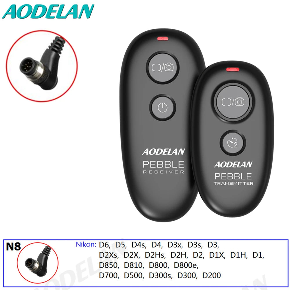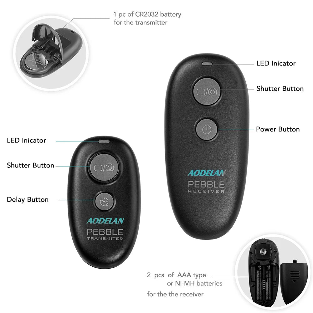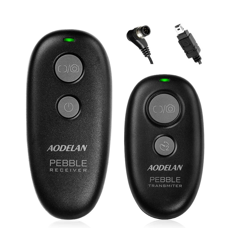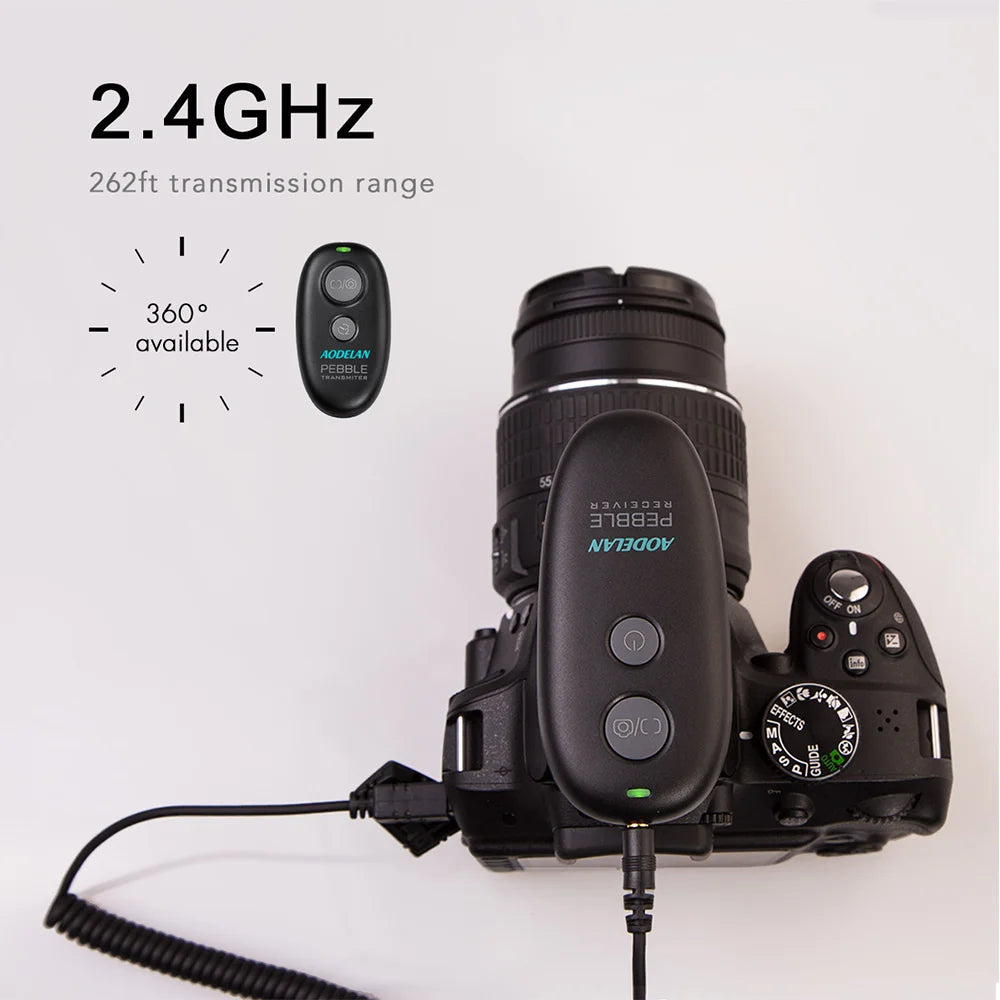 AODELAN PEBBLE wireless remote shutter release. Support autofocus, single shooting, continuous shooting, high speed continuous shooting, BULB shooting, delay release of 3s shooting. Wireless and wired operations. Reduce camera shake and allows you to trigger your camera wirelessly up to 262ft/80 m.