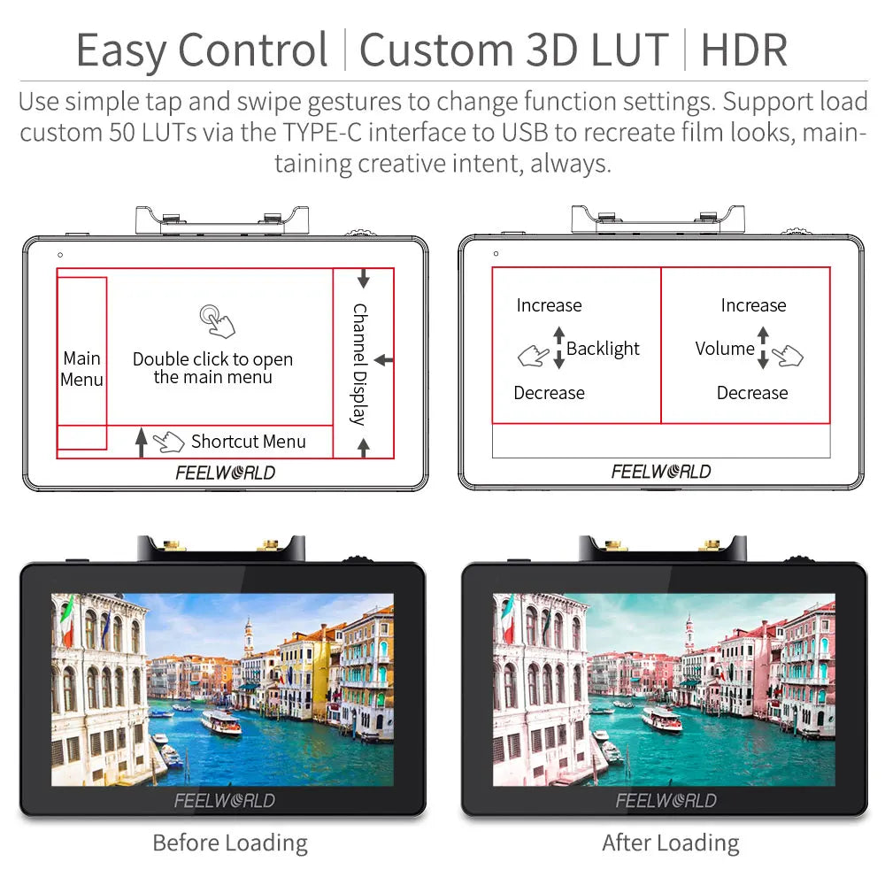 FT6, FR6 have built-in HLG 2020, HLG 709, HLG P3 HDR 3D LUT, and Rec709 De-slog3 LUTs, includes SLOG2, SLOG3, LOGC, VLOG. The monitor can display an HDR (high dynamic range) signal for incredible clarity and detail, simplify the complexities of shooting Log and HDR, helping you to replicate post-production workflows at the moment when it matters most–while shooting.