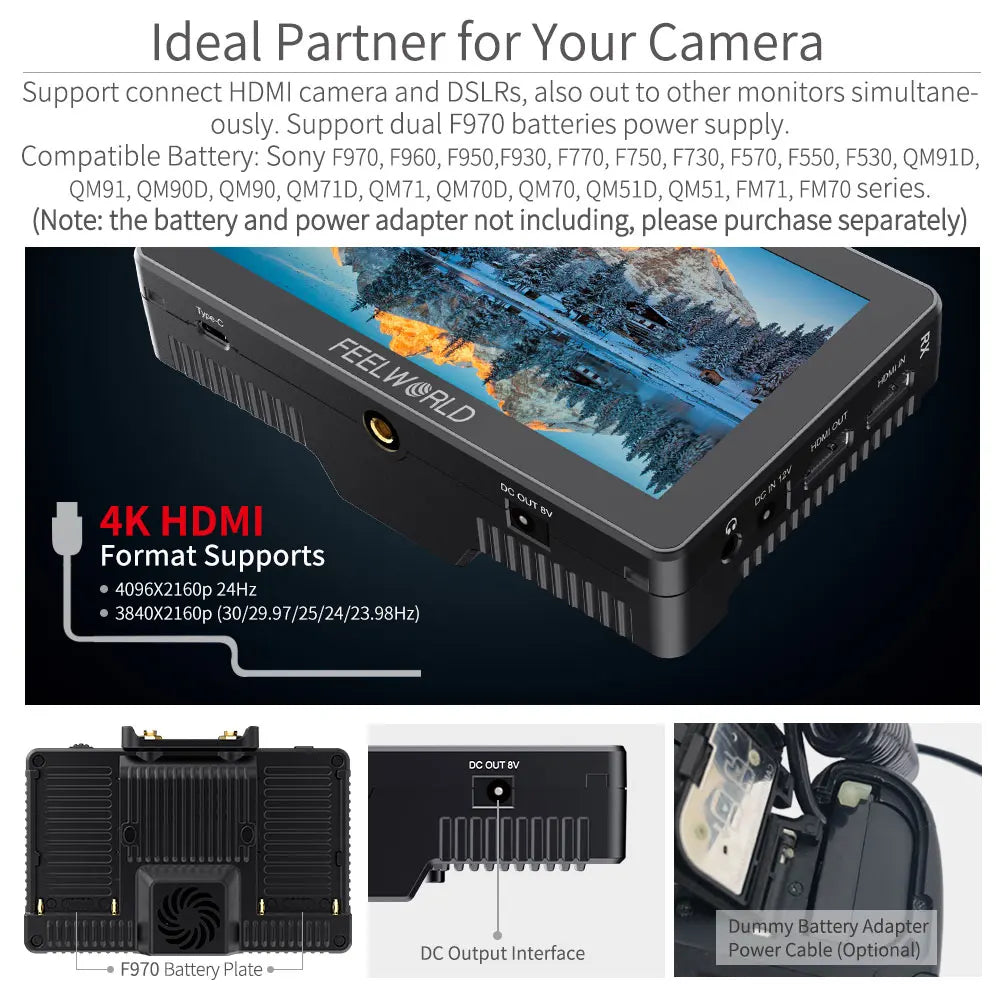 In addition to the 12V universal power supply; FT6, FR6 also have dual battery slots in the back. You get 2 rear battery slots for installing Sony L Series batteries, so you have enough power for the screens. Plus with 2 battery slots, you can change batteries without interrupting monitoring, just need to double-tap the battery icon on the upper right corner of the monitor, after about 3 seconds switch to the other battery. The monitor install one F970 battery (6600mah) last for about 2 hours, and install two F970 batteries last for about 4-5 hours. You can choose install 1 or 2 battery base on your need.