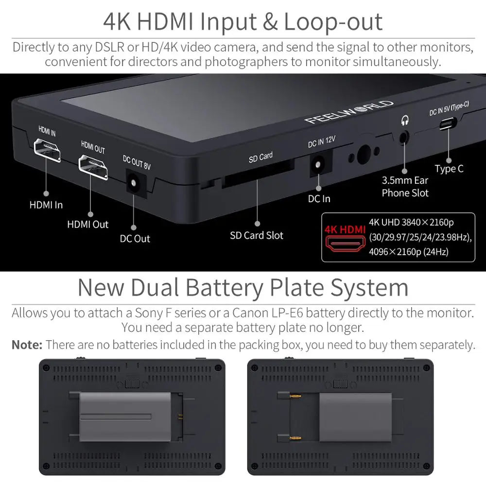 The F6 PLUS V2 has 4K HDMI in and loop-out, allowing it to not only display live signals, but also send them out to other monitors simultaneously. It's the ability to display live picture on multiple displays at once while still maintaining the original video quality. Plus, you can monitor audio using the 3.5mm stereo headphone jack.