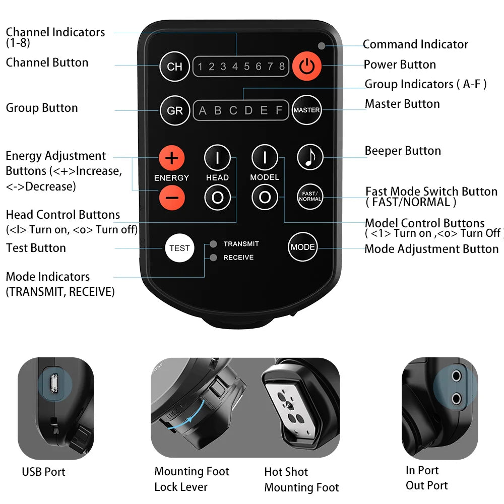 1. Compatible with Profoto radio system, wirelessly trigger and manually control Profoto lights which has built-in Air system, including flash power control and modeling ligth control.