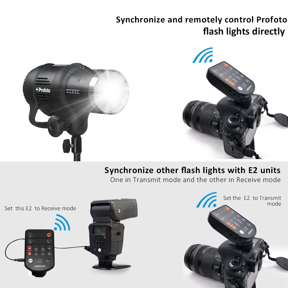 AODELAN E2 is a transceiver compatible with Profoto radio system. It can be used to wirelessly trigger and manually control Profoto lights which has built-in Air system, including flash power control and modeling ligth control. Open frequency band (2.4GHz)- approved for worldwide use.