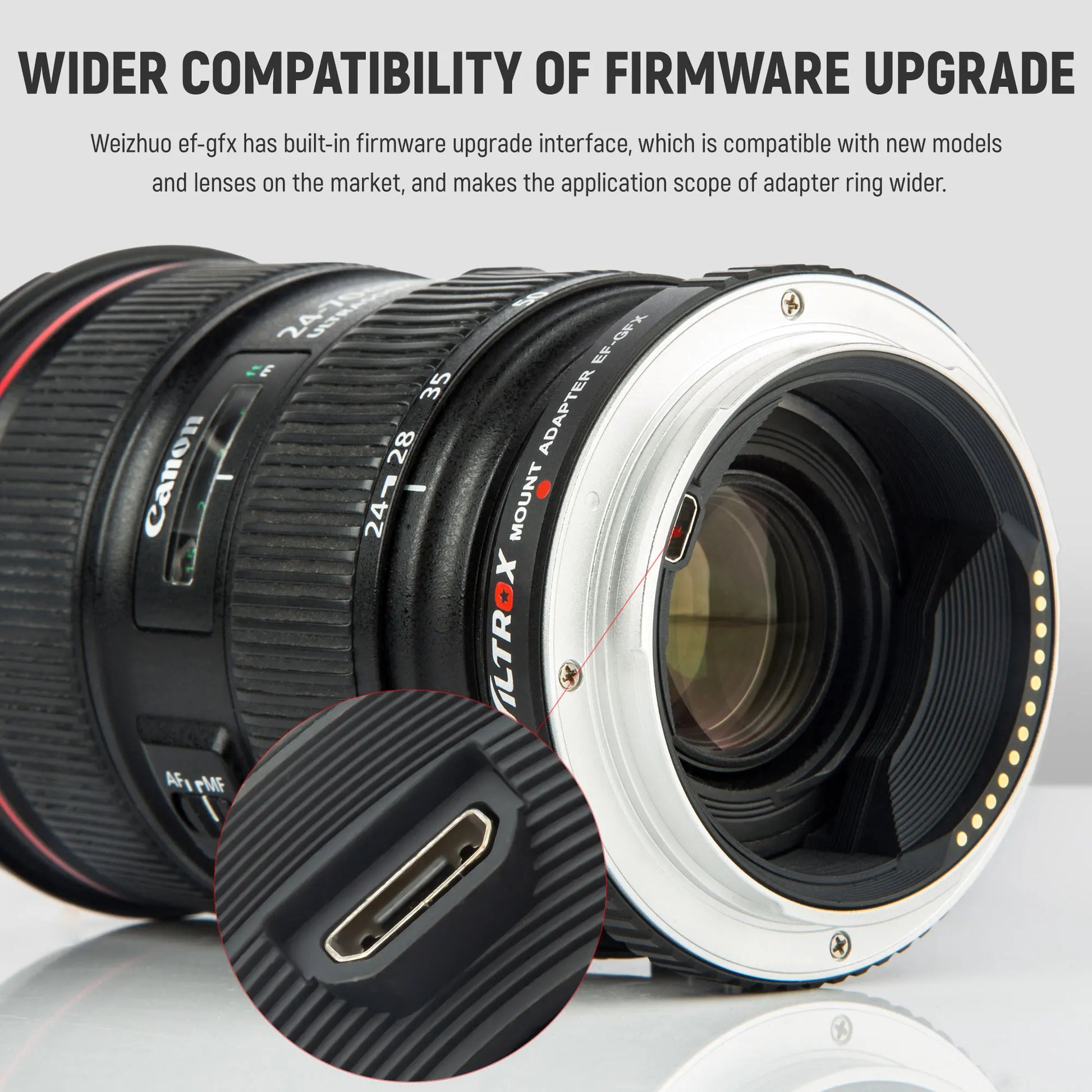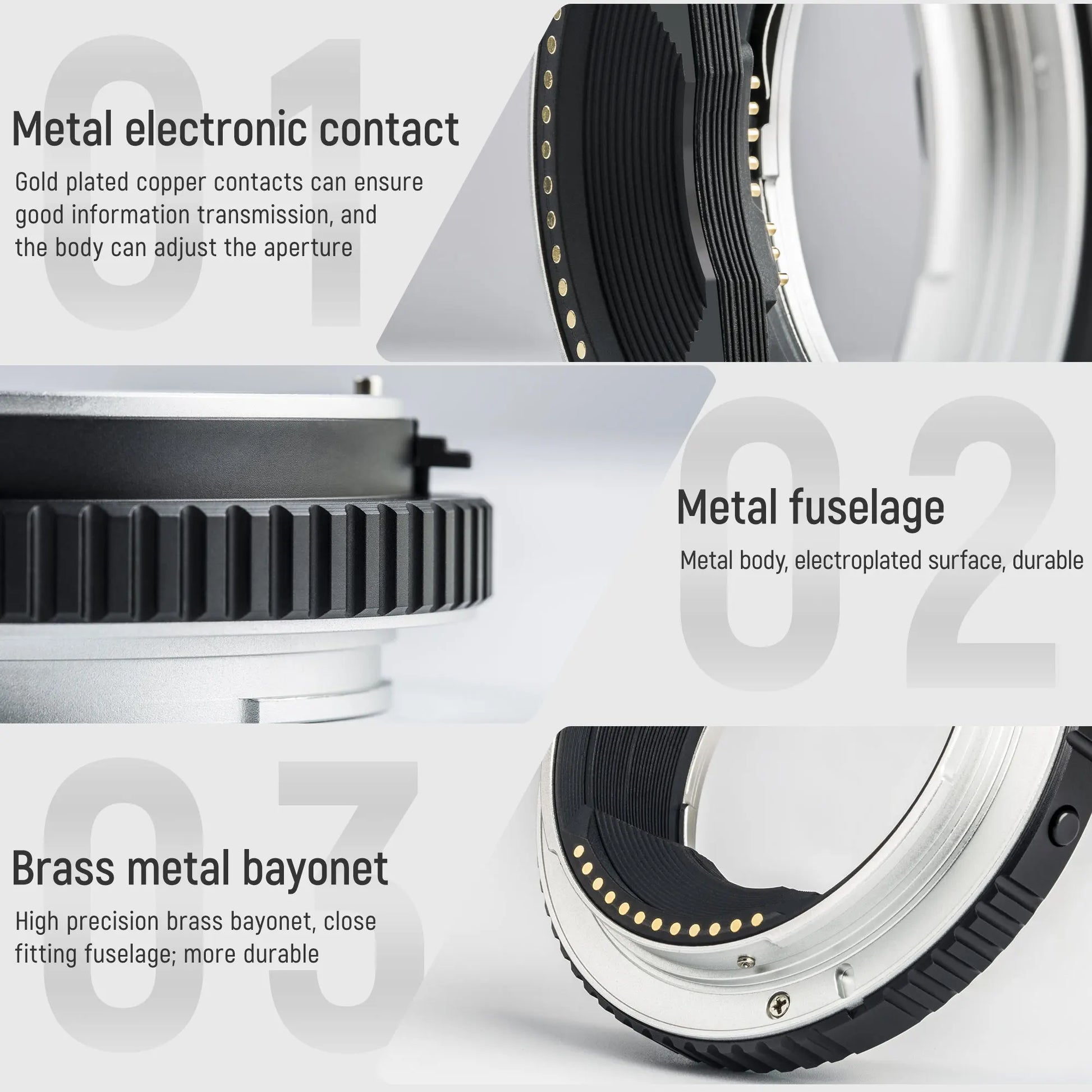 It is with inbuilt electronic contacts and the bayonets are made of metal with surface plating treatment, being durable and sturdy. It also features AF function. Firmware can be upgraded by a USB port.