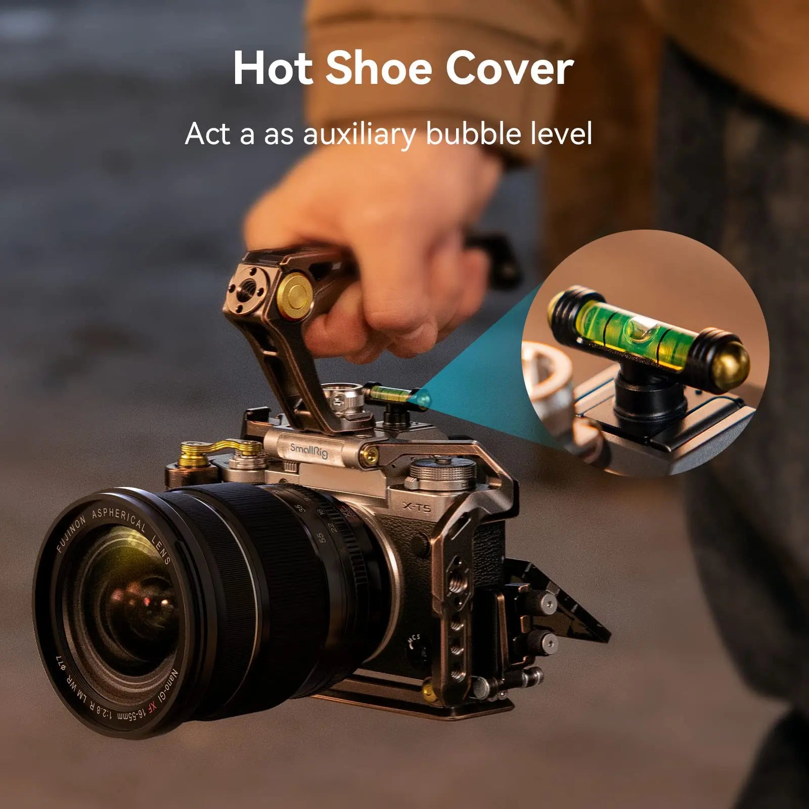 SmallRig Retro Handheld Cage Kit for FUJIFILM X-T5 3872 is designed to facilitate low-angle shooting, protect the camera, and provide accessory mounting points. The kit includes a cage, a top handle and an HDMI & USB-C cable clamp, and a hot shoe cover. The cage is endowed with a new punk style featuring a shutter button adapter frame and an ergonomic leather grip for improved shutter control and grip experience. Accessory mounting points include: 1/4"-20 threaded hole, 3/8"-16 threaded hole, ARRI 3/8"-16 locating hole, cold shoe mount, NATO rail, suitable for magic arm, side handle, top handle, rod clamp, baseplate, LED video light, microphone, etc. With a new press-and-flip design, the HDMI & USB-C cable clamp gives easy access to the camera interface cover while preventing accidental disconnection to ensure stable signal transmission. The ergonomic top handle makes low-angle shooting comfortable and stable. Besides, there is a bubble level in the hot shoe cover for calibration.
