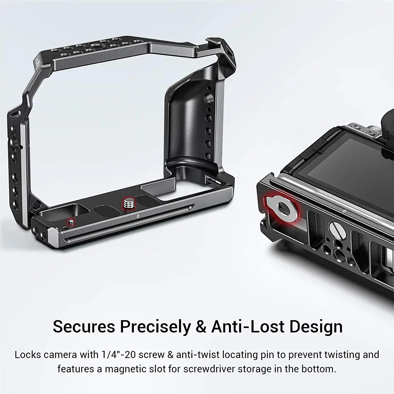 SmallRig Cage for FUJIFILM X-T4 Camera CCF2808 is a formfitting full cage designed to provide protection, accessory mounts and a comfort grip for X-T4. The cage secures to the bottom of camera via a 1/4”-20 screw and features an anti-twist pin for further secure to prevent twisting. Featuring multiple 1/4”-20, 3/8”-16 and ARRI 3/8”-16 accessory threads for accessories, such as Top Handle 2165, Side Handle 2093 and Monitor Mount BSE2348. The cage integrates with a cold shoe on the top for microphone and light, and features a NATO rail on the left side for NATO Handle 2187. You can also attach the dedicated HDMI & USB Cable Clamp BSC2809 to protect HDMI and USB cable. The bottom integrates with Arca Swiss plate and a flat head screwdriver is included to secure the camera screw and stores on the bottom of the cage. Additionally, the cage provides strap slot on each side for carry strap.