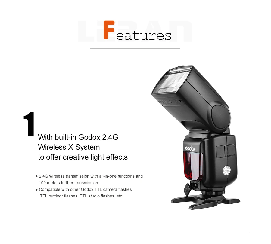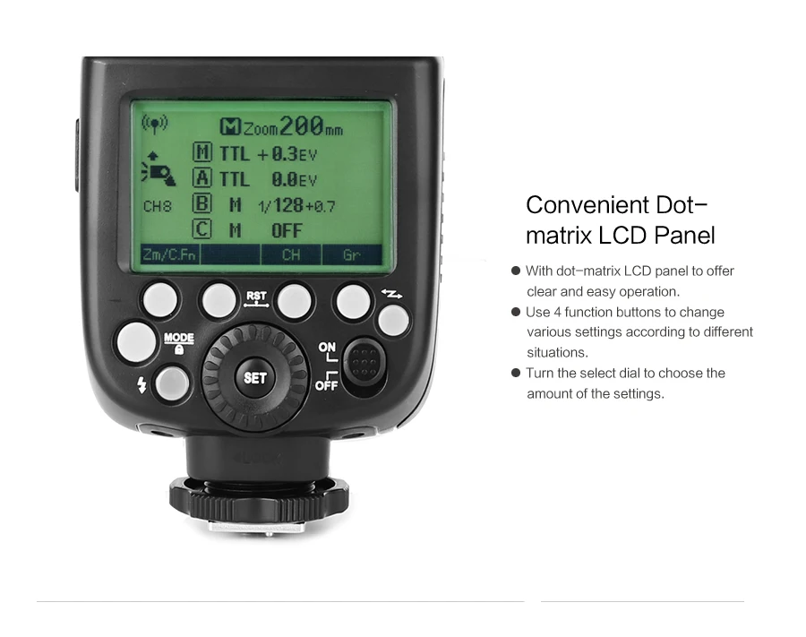 Sync Triggering Mode: Hotshoe, 3.5mm sync line, Wireless control port