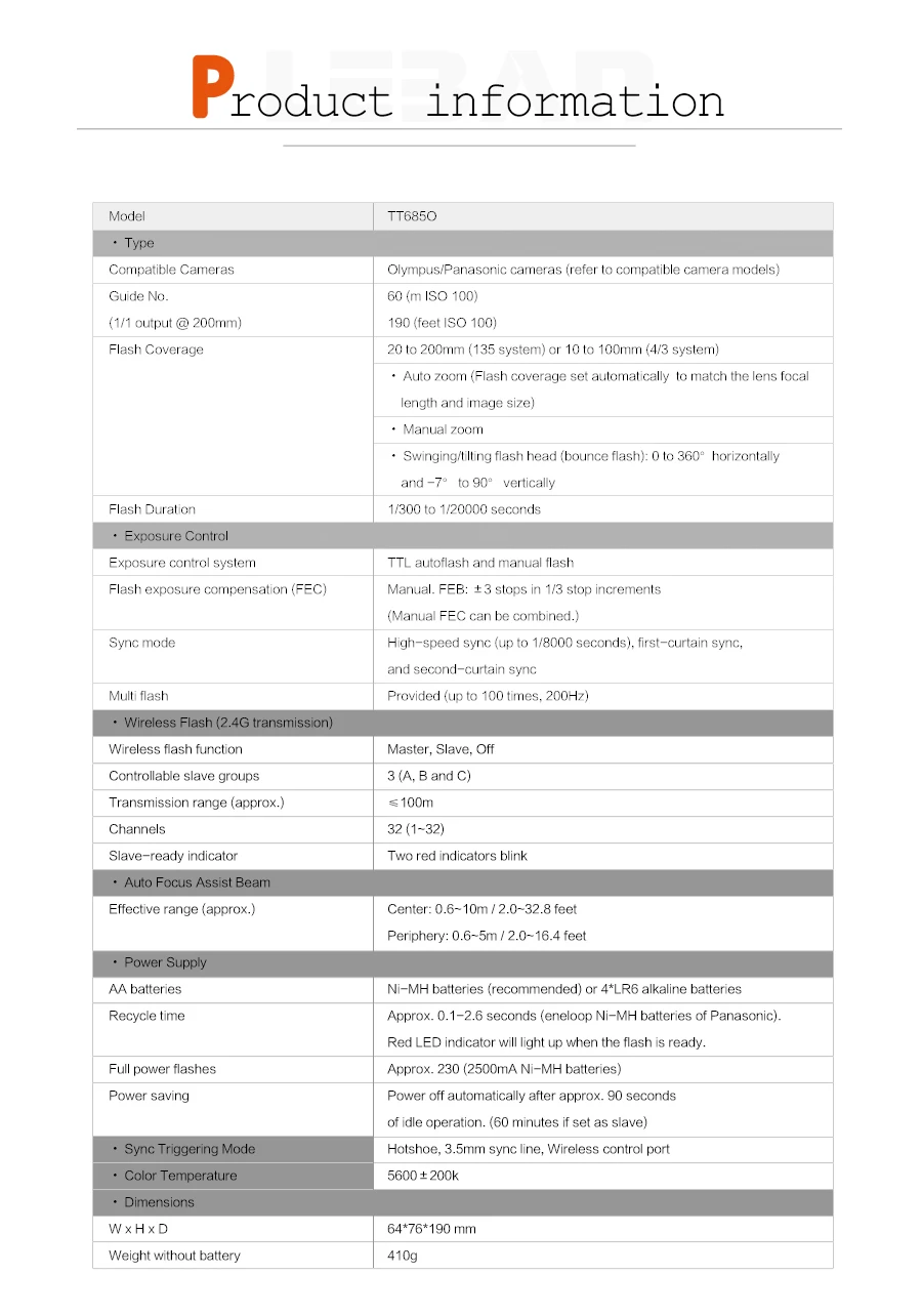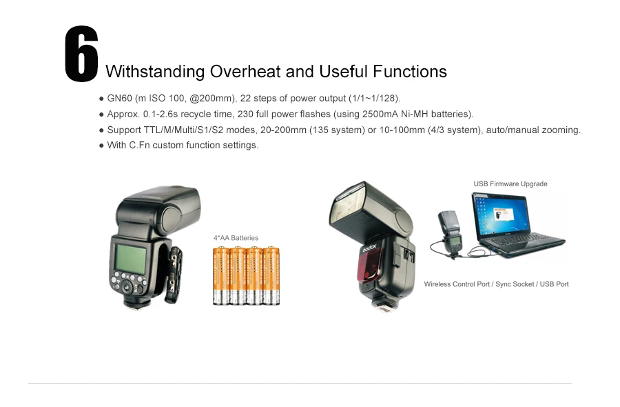 Guide No. (1/1 output @200mm): 60(m ISO 100); 190 (feet ISO 100)