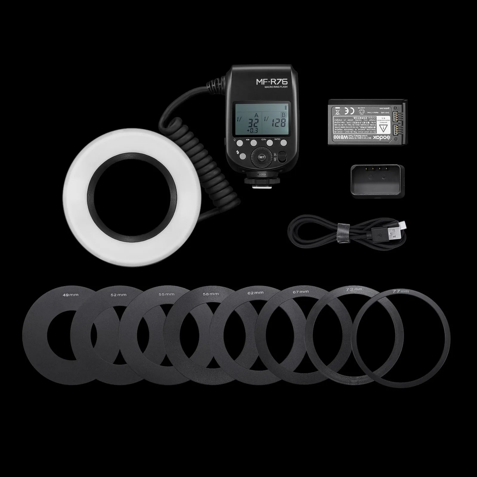 Godox MF-R76 macro ring flash combines ingenious design, powerful performance, and a wide range of uses. It supports independent AB lamp flashing, 10-level brightness adjustment, and precise setting of flash power output. It is very suitable for insect photography and oral dentistry. Photography, jewelry photography and other scenes can provide you with more professional macro photography solutions.
