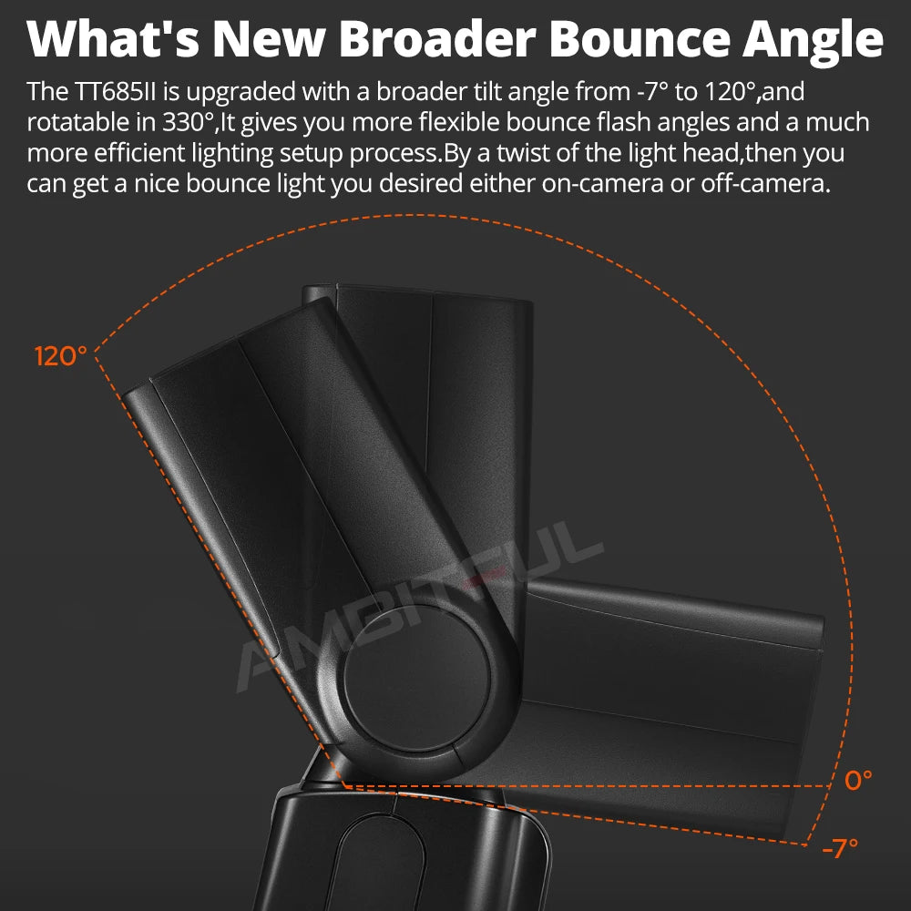 Manual zoom: Flash head swing / tilt (bounce flash): 0 to 330 ° horizontally, -7 ° to 120 ° vertically