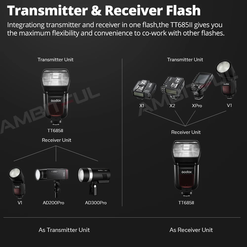 Controllable receiver groups: A, B, C, D, E (E group can be controlled by X-series flash trigger)