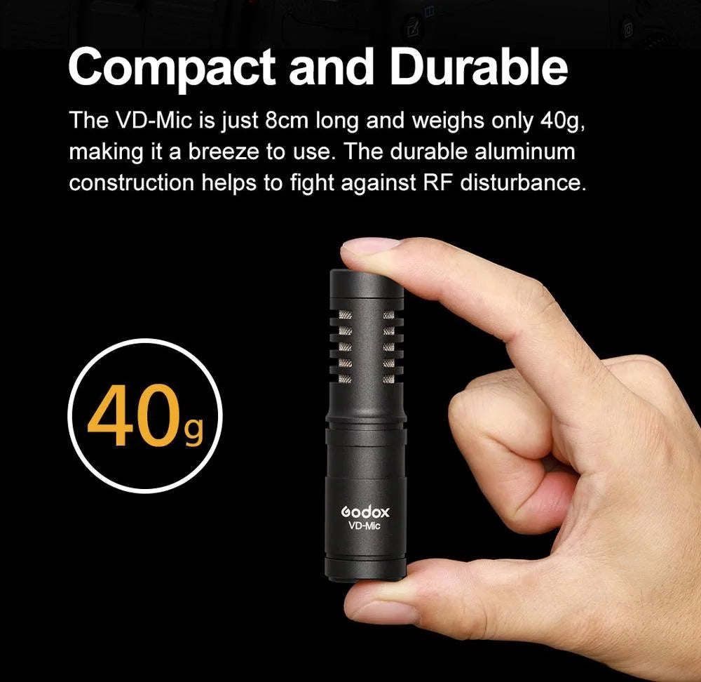 The VD-Mic is just 8cm long and weighs only 40g,making it a breeze to use.The durable aluminum construction helps to fight against RF disturbance.