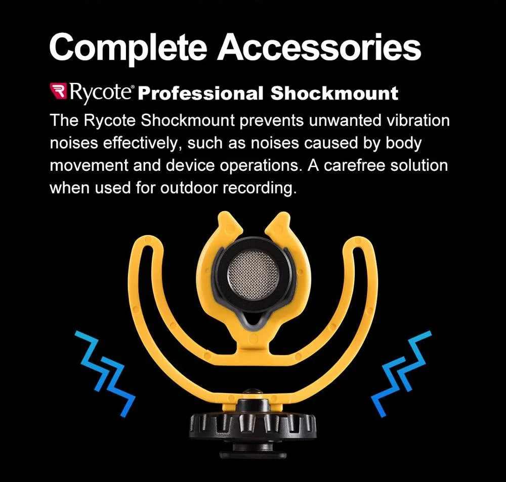 The Rycote Shockmount prevents unwanted vibration noises effectively, such as noises caused by body movement and device operations.A carefree solution when used for outdoor recording.