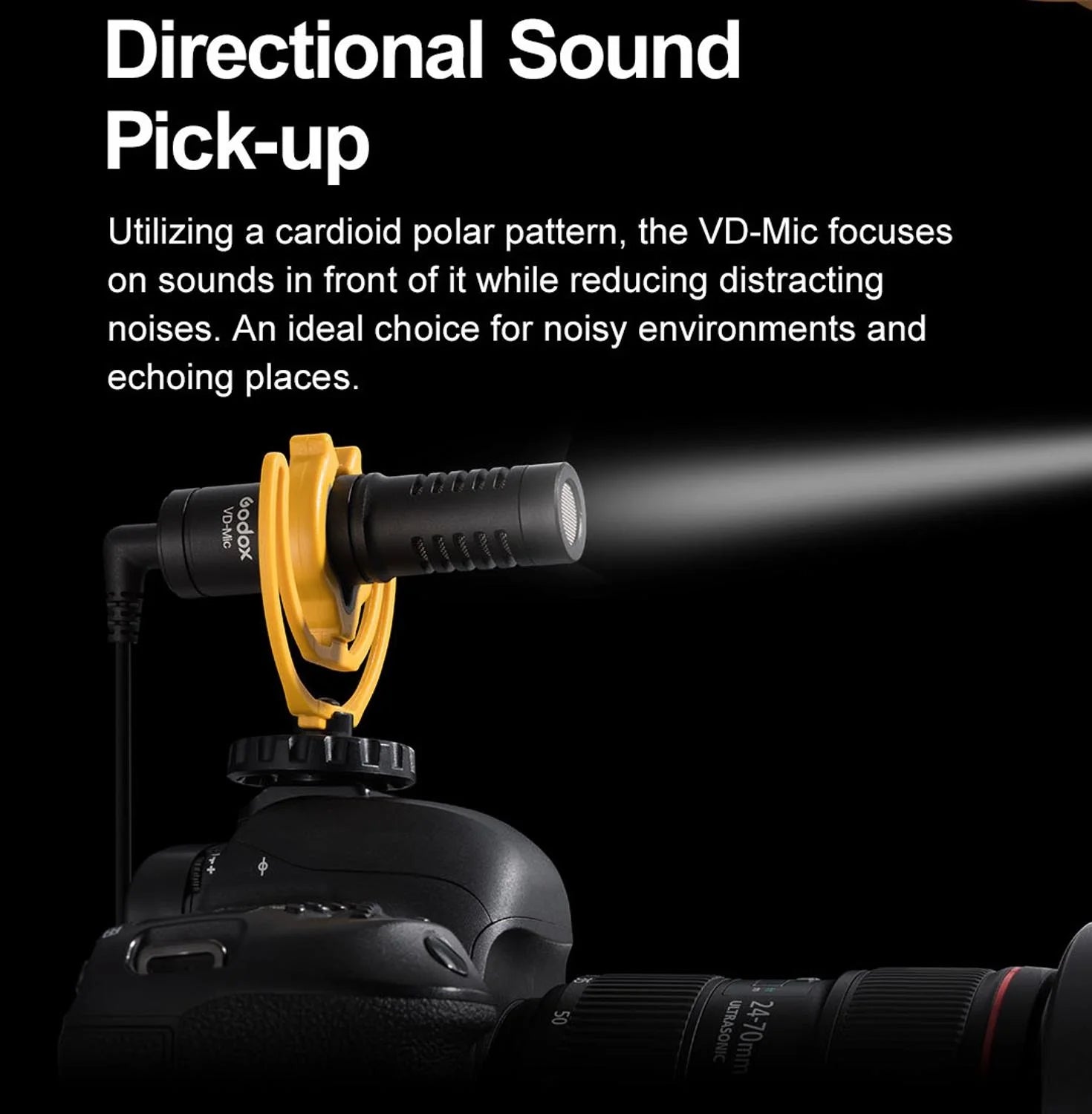 VD-Mic is a lightweight and super compact directional shotgun microphone, offering improved sound quality to your recording; it picks up sound in front of the microphone clearly while attenuating the surrounding noises.A perfect choice for vlogging, live streaming, interview and more.
