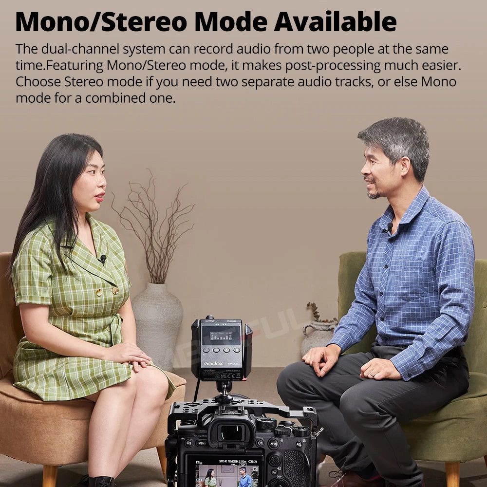 The dual-channel system can record audio from two people at the sametime.Featuring Mono/Stereo mode, it makes post-processing much easier.Choose Stereo mode if you need two separate audio tracks, or else Monomode for a combined one.