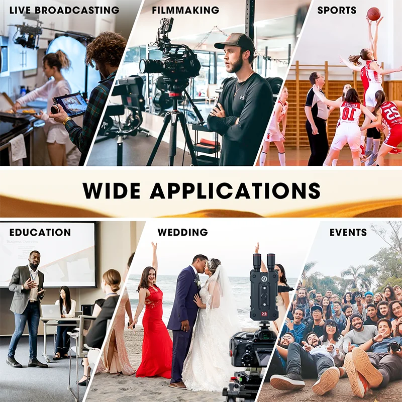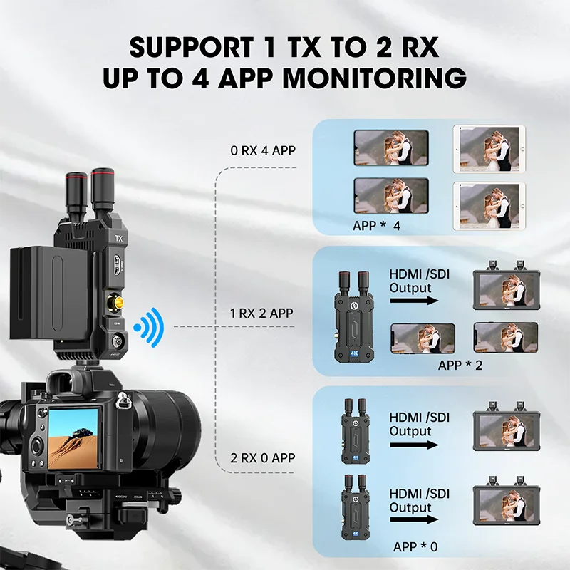 【Up to 4 APP Monitoring Options】Mars 4K supports wireless transmission to RXs/iOS/Android phone/tablet devices. When using 1TX to 1RX, it allows 2 monitors via HDMI&SDI cable and 2 mobile devices APP monitoring. When using 1TX without RX, it allows 4 APP monitoring. You can also pair another Mars 4K RX to the system, and wire them to 4 monitors for the director/producer/sponsor to view the shooting on set.