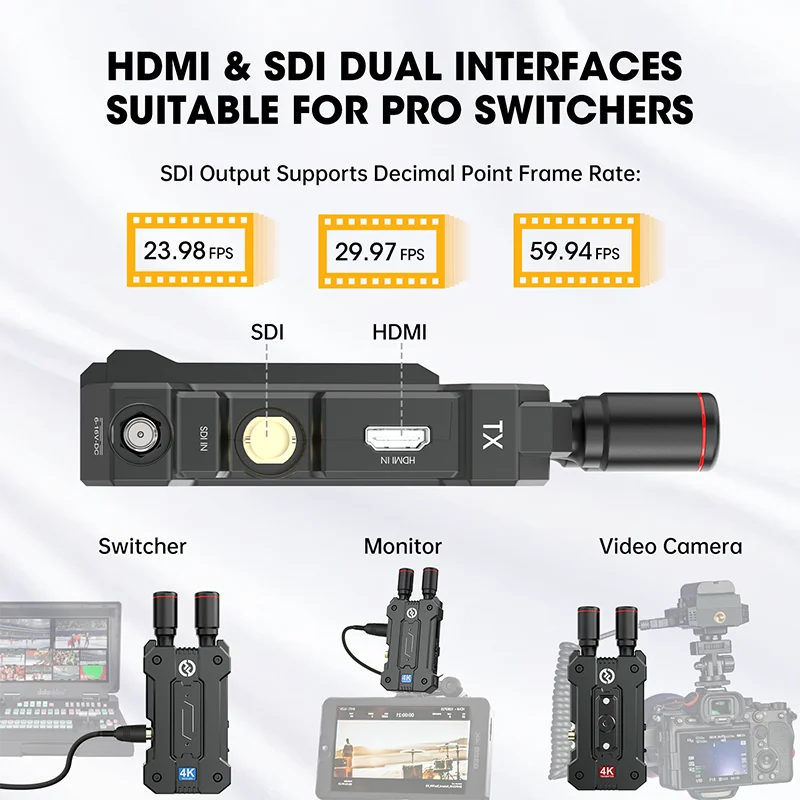 【HDMI 4K, SDI Decimal-point IN&OUT】Hollyland Mars 4K comes with HDMI and SDI options for various applications and compatibility. The 3G-SDI port supports broadcast and production standards frame rate output (23.98/29.97/59.94 FPS) for professional equipment like video switchers. HDMI supports up to 2160p/4K input output. Cross conversion is supported from TX to RX, so HDMI and SDI can output at the same time.
