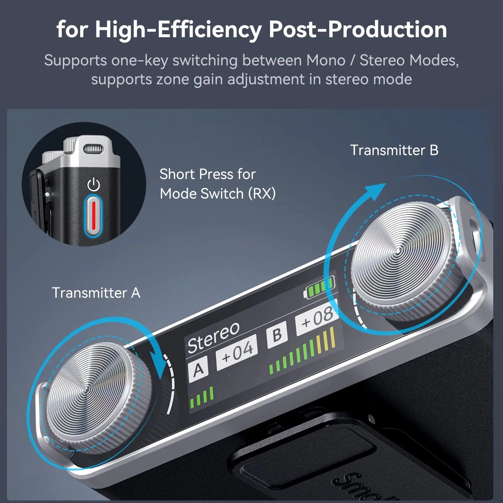 The product is sturdy and smart and comes with RX and TX equipped with a large-capacity Li-polymer battery that allows battery life of up to 8 hours on a single charge. Stable wireless audio transmission boasts a maximum signal range of 100 meters (no obstacles); switch between mono and stereo, stereo recording and sound reproduction enhance post-editability; input and output volume of TX-A and TX-B are partitioned and independently adjustable; low-frequency noise below 200Hz can be eliminated to make purer audio output. It is plug and play and features smart pairing to be widely used in outdoor live streaming, mukbang, interview recording, video recording, online teaching, bringing users professional audio experience.