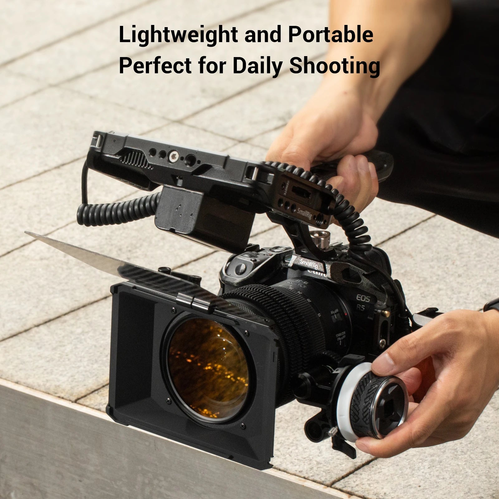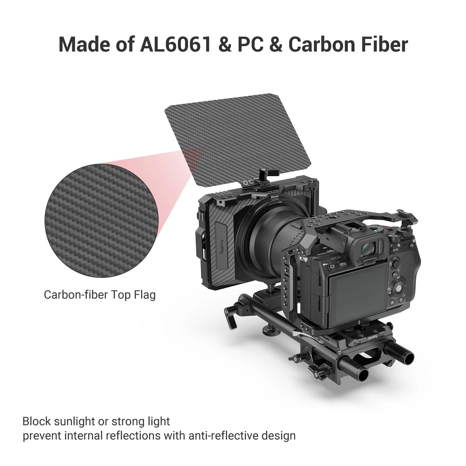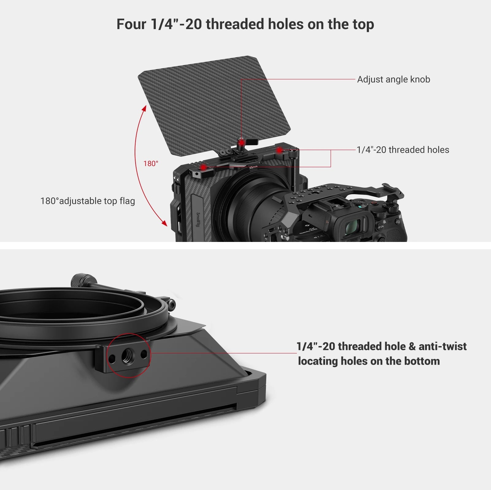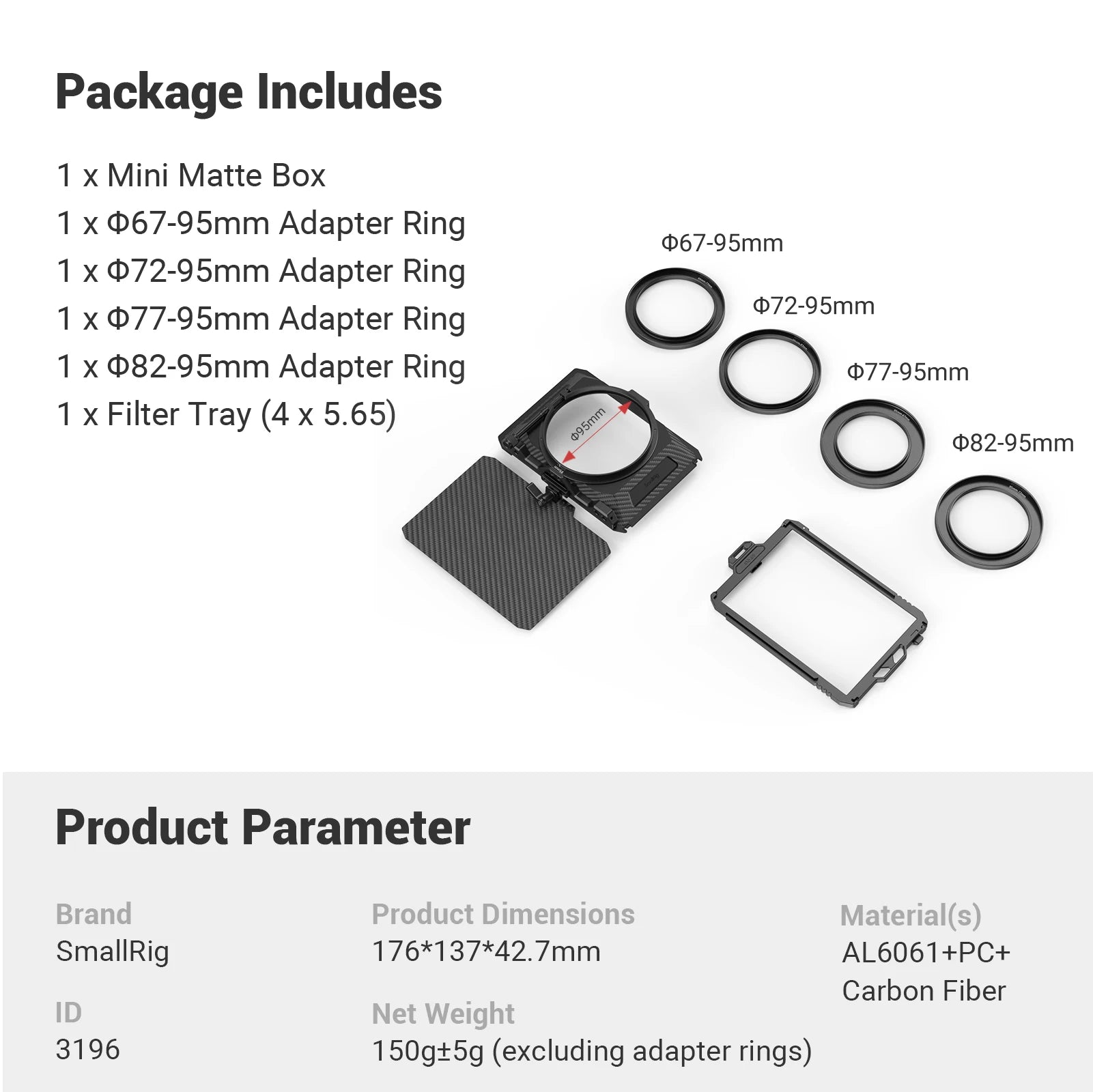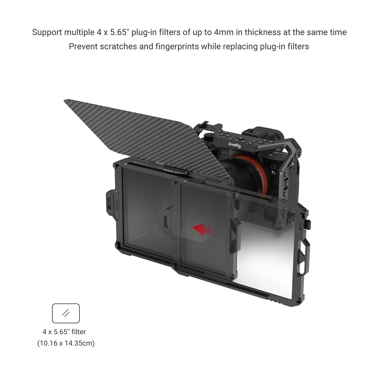 SmallRig Mini Matte Box 3196 is designed for DSLRs and mirrorless cameras to prevent sunlight or other light from causing glare and flare and to control images on the screen. Its clamp connector works with adapter rings of various sizes (Φ52-95mm; Φ55-95mm; Φ58-95mm; Φ62-95mm; Φ67-95mm; Φ72-95mm; Φ77-95mm; Φ82-95mm; Φ86-95mm) or attached directly to Φ95mm lens; its adapter ring fits round CPL, ND filter and other round filters of up to Φ92.5mm. The filter tray 3319 can be quickly mounted onto the matte box via a NATO clamp and supports multiple 4 x 5.65" plug-in filters of up to 4mm in thickness at the same time. It is easy to store and prevents scratches and fingerprints while replacing plug-in filters. The adjustable carbon-fiber top flag blocks sunlight or strong light and also prevents internal reflections with its anti-reflective design. Top 1/4"-20 threaded holes enable easy attachment of other accessories and anti-twist 1/4"-20 threaded holes on the bottom suits 15mm LWX Rod Support2663.