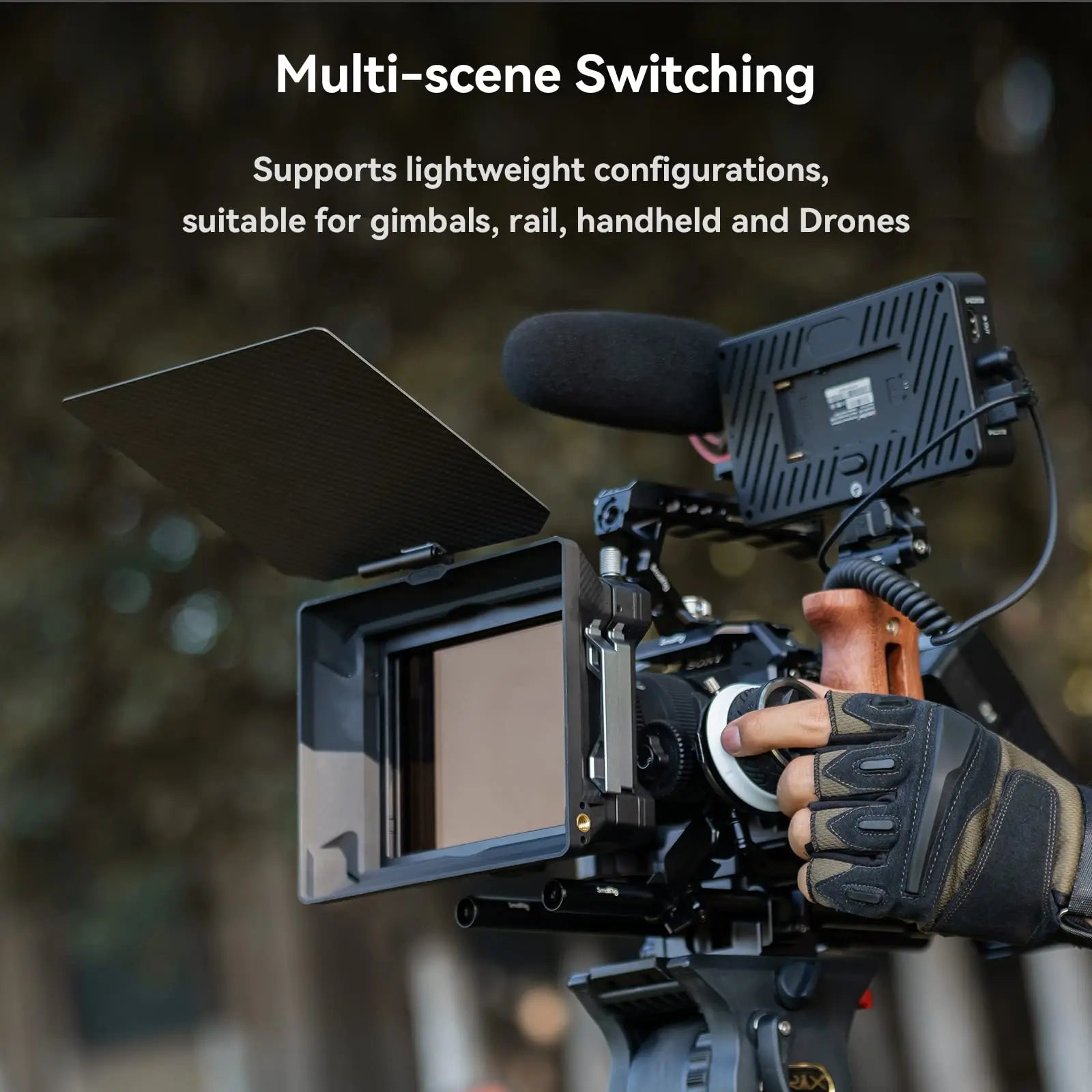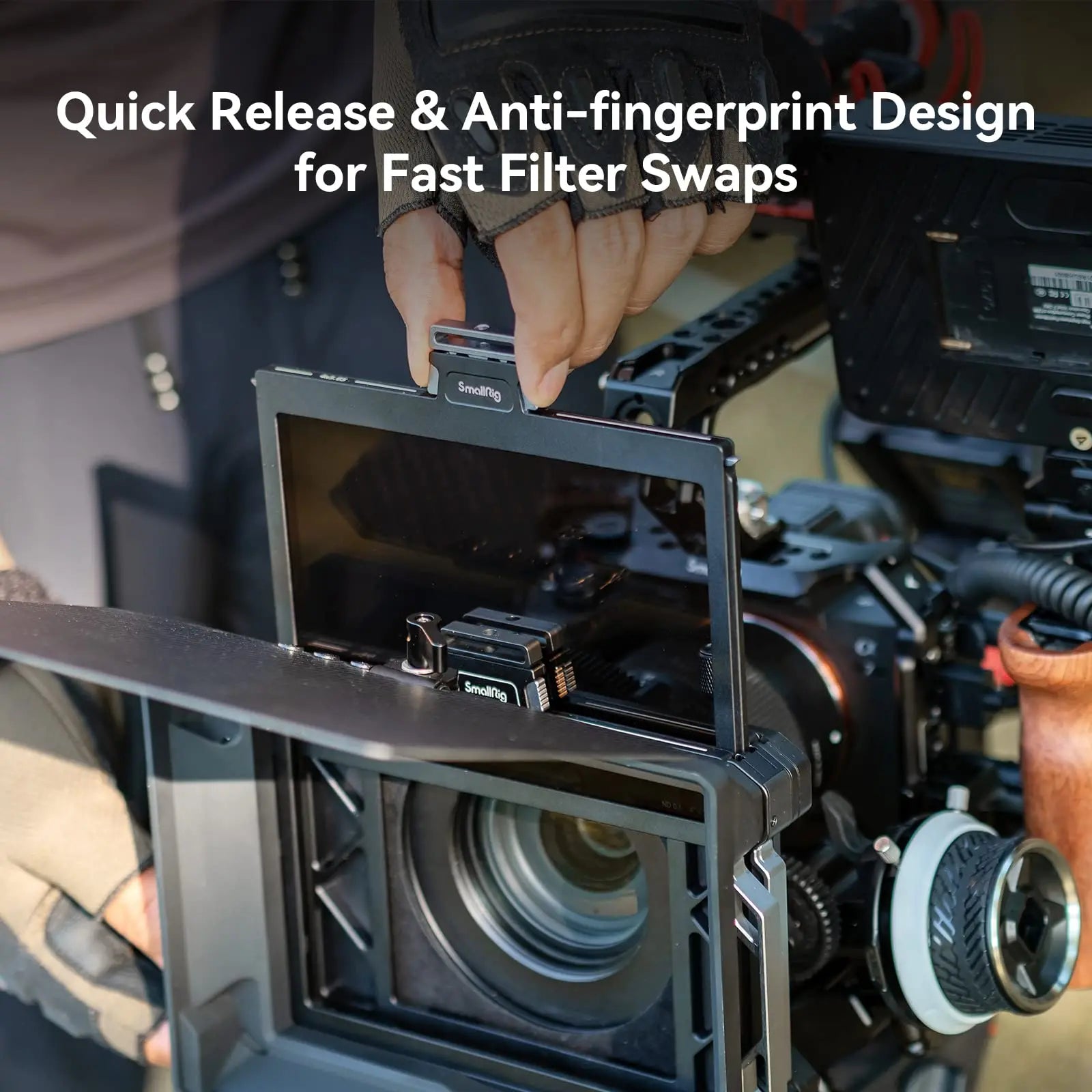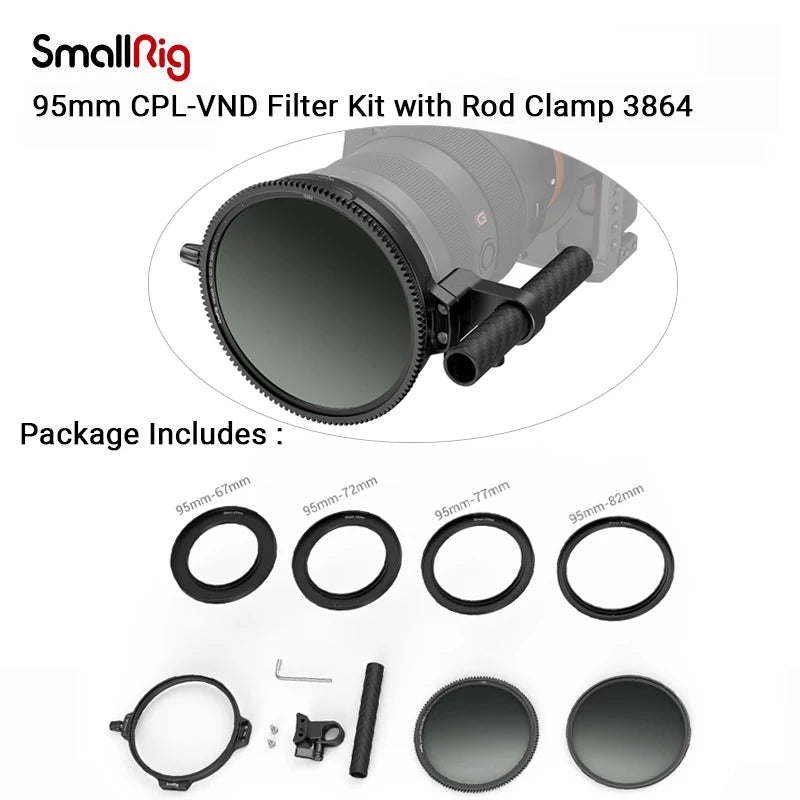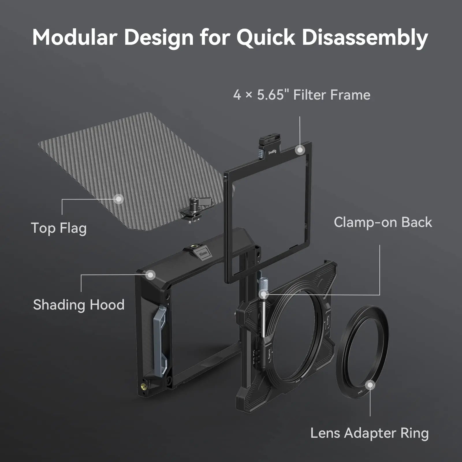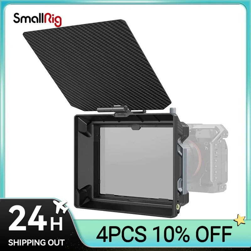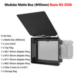 As one of the Star-Trail series matte box, SmallRig Multifunctional Modular Matte Box (Φ95mm) Basic Kit 3556 is designed for mirrorless cameras to prevent sunlight or other light from causing glare and flare and to control images on the screen. It comes standard with four threaded adapter rings (Φ67-95mm / Φ72-95mm / Φ77-95mm / Φ82-95mm) for circular filters like VND, GND, CPL, common DSLR lens and Φ95mm cine lens or you can separately purchase Adapter Rings Kit (Φ52-95mm / Φ55-95mm / Φ58-95mm / Φ62-95mm / Φ86-95mm) 3383 for more compatibilities. The kit also includes a filter frame (4x5.65") featuring aluminum alloy frame and anti-off design, which can be quickly installed without leaving fingerprints. For attaching 4x4" filter, please purchase Filter Frame 3648; for holding multiple slid-in filters at the same time in complex environment, please purchase Filter Frame Kit (4x5.65") 3649 or VND Filter Kit 3651. Thanks to the formfitting filter system, ultra-wide angle shot using ≥14mm focal length becomes possible. Among other accessories, the lens hood features magnetic installation and quick release design and the carbon fiber top flag opens 180°. To prevent more glare, please purchase Side Flag Kit (95mm) 3647; to support and protect lens, please purchase Rod Support 3652. Our Star-Trail series matte box use plenty of lighter magnesium alloy and carbon fiber to provide lightweight shooting solutions.