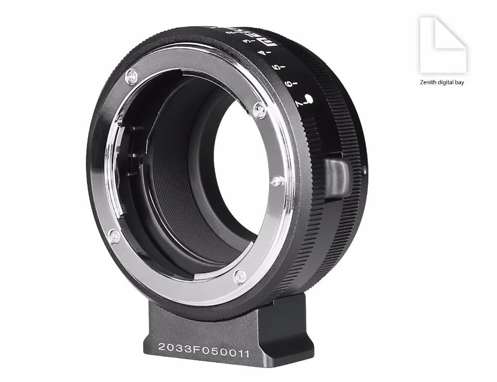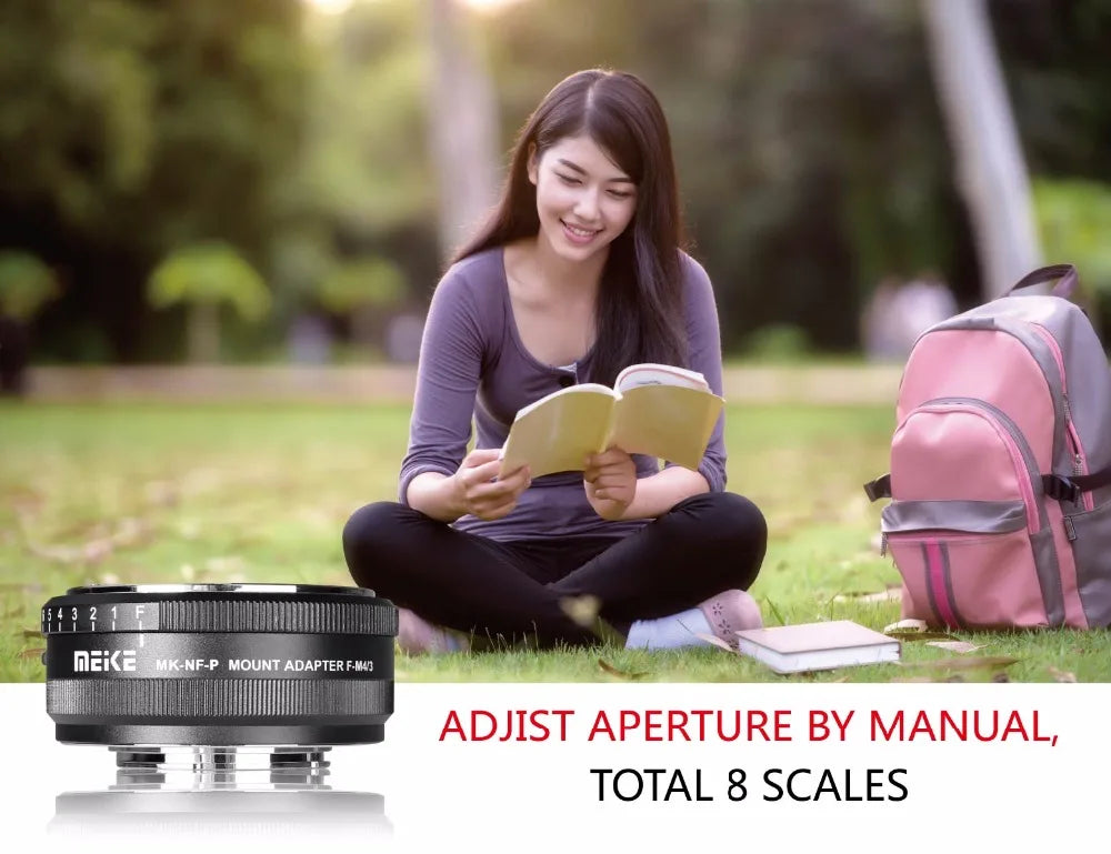 6.MEIKE MK-NF-P Aluminum bayonet, all metal body, sturdy and durable,Surface use anti-slipping drawbench,easy to install and remove lenses (or cameras),the adapter can use 8 scales(F-7)to manually adjusted aperture according to different scenes and shoot the desired effects. standard 1/4" tripod screw allows you to mount it on tripod easily and Stable.When the adapter and lens are installed on the camera, you can shoot directly. If you can't shoot, please adjust the camera mode to "shooting without lens mode" or contacting with the servicer.