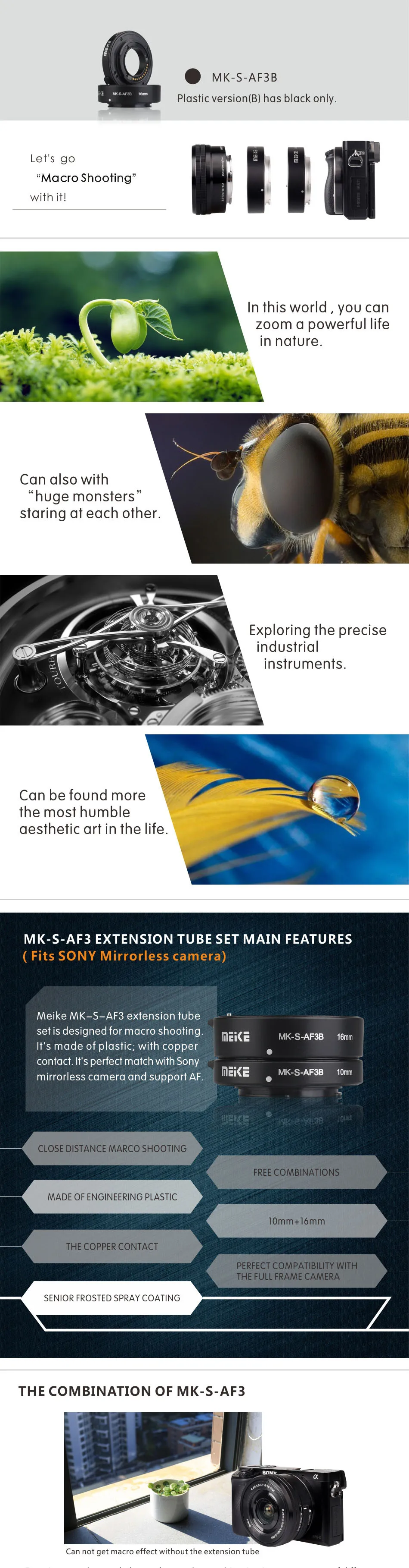 MEKE Meike MK-S-AF3B AF Extension Tube Adapter Ring Lens for Sony NEX Micro DSLR (10mm, 16mm) E-Mount NEX-3 NEX-5 Camera