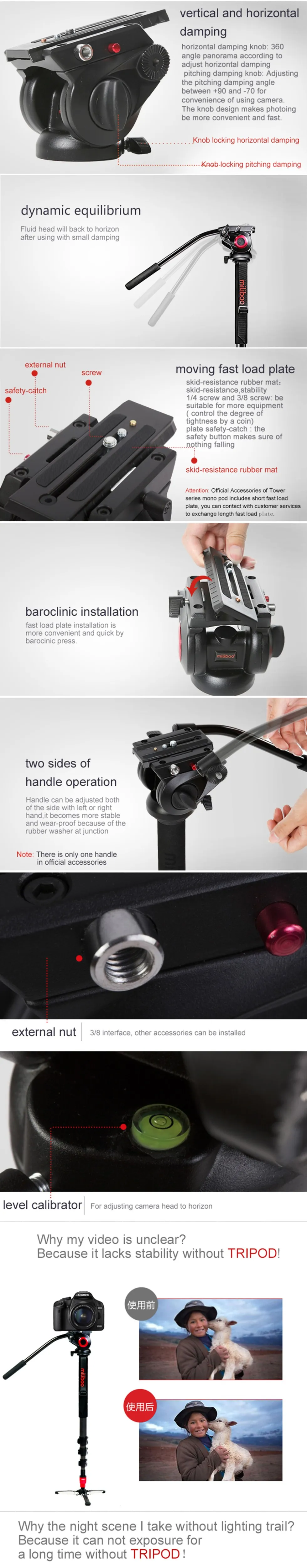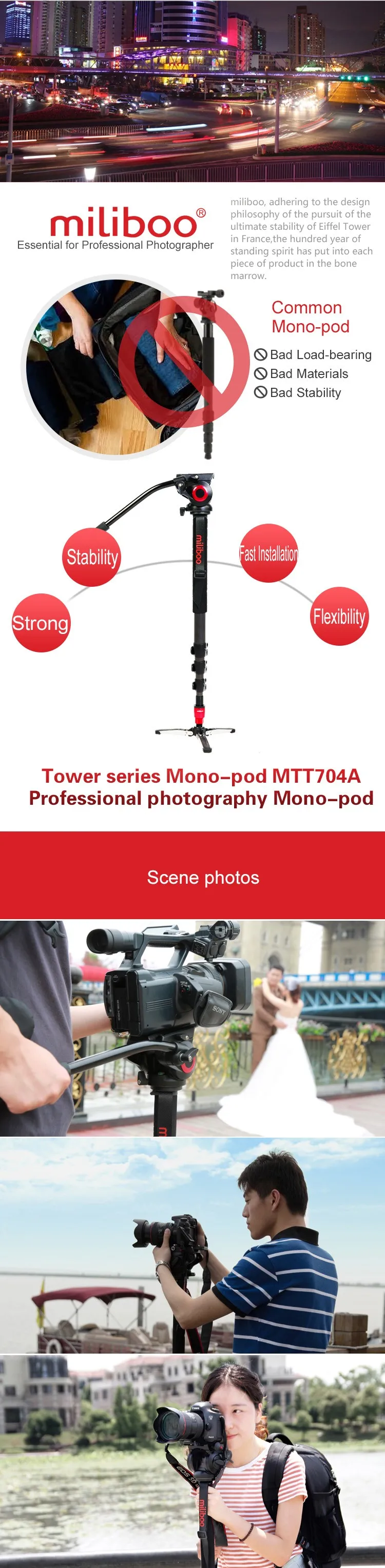 Mono-pod has the unique characteristics of potability and flexibility for outdoor photography and ruleless moving occasions.In the occasions of photoing wild animals, climbing and so on need carrying requirements, the mono-pod can be as a climbing stick.There is no more space for tripod in sports events, concerts,and on-the-spot news reports occasions.Not only capturing movements, but also possessing stability,anti-shaking and flexibility.miliboo brings photography more possibilities.