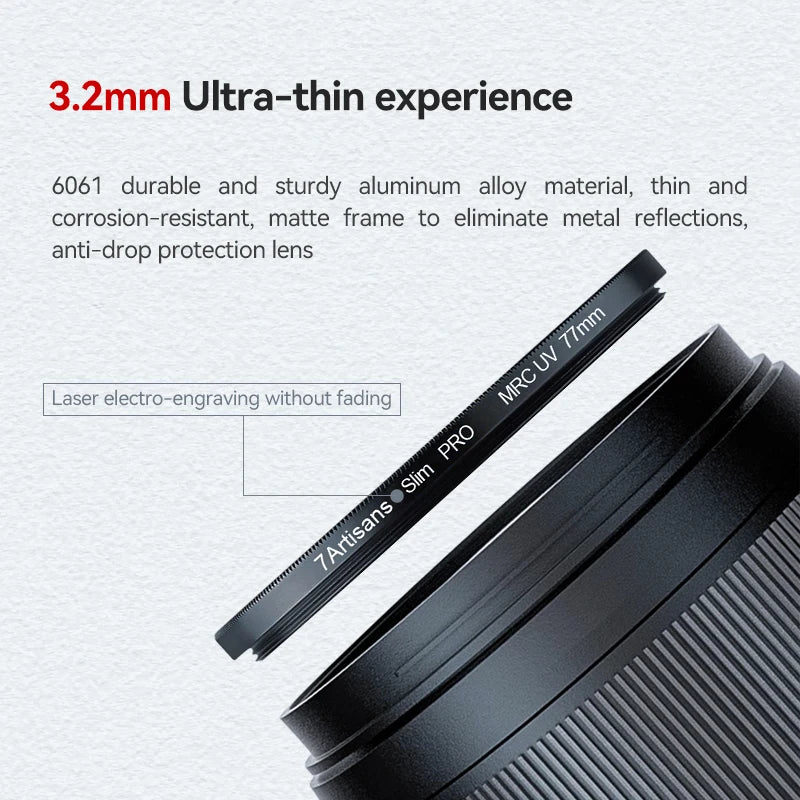 This 7Artisans MRC-UV Filter is designed to absorb ultraviolet light and remove haze. It also serves as a general lens protector.