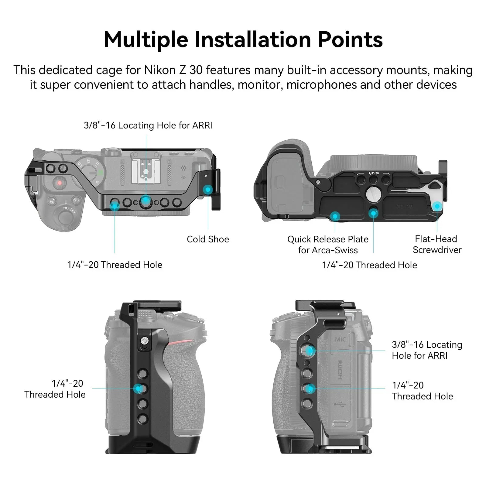 SmallRig Cage for Nikon Z 30 3858 is designed to provide protection and accessory mounts. Securing the camera via a 1/4"-20 screw and a side lock adapter on the right, the cage has silicone cushions that prevents scratches and maintains full access to all buttons, interfaces, the flip screen, etc. It also comes with a hinge arm at the battery door that fits camera curve for a comfortable grip and facilitates battery replacement; 1/4"-20 threaded holes and ARRI 3/8"-16 locating holes for Top Handle HTS2756, 3765, Side Handle HSS2425, 3814, HDMI Cable Clamp 1822; and a cold shoe mount on the top for microphone and LED light for Vlogging. An Arca-Swiss quick plate at the bottom supports Arca-Swiss tripod and DJI RS 2 / RSC 2 / RS 3 / RS 3 Pro stabilizer for quick switch among tripod, stabilizer and handheld modes. In addition, a magnetic double-ended wrench at the bottom is available to assemble and disassemble for your convenience.