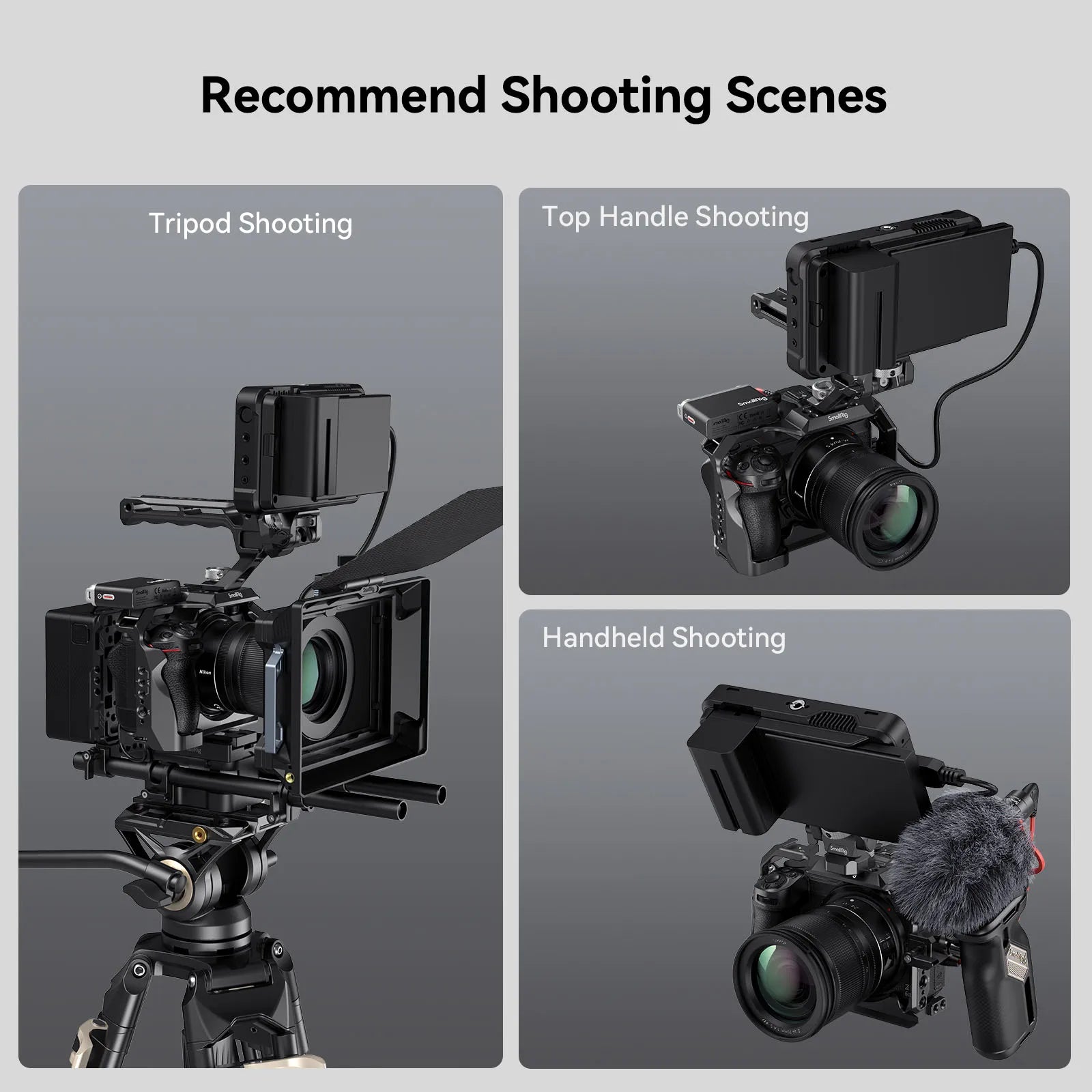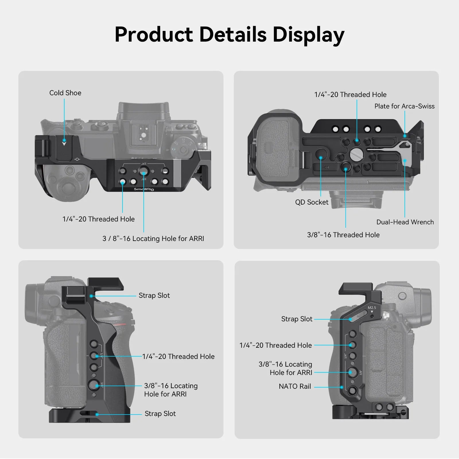 SmallRig Camera Cage for Nikon Z 5 / Z 6 / Z 7 / Z 6II / Z 7II 2926B is designed to provide protection and attach accessories. It locks camera via a 1/4”-20 screw on the bottom and a M2.5 screw on the left side, with pads preventing scratches. The cage maintains access to camera buttons, card clots, screen, and battery door and also comes with multiple accessory mounts. They include: 1/4"-20 threaded hole, 3/8"-16 threaded hole, ARRI 3/8"-16 locating hole for Side Handle 2093 & 3814, Top Handle 3765, Monitor Mount 2903 & 2904, Manfrotto Bottom Plate 1280 & 2458, Holder for Portable Power Banks 2336 and mini V Mount Battery Plate 2987; 1/4"-20 locating holes on the side that support Single Rod Clamp 3598, Magic Arm 3873; NATO rail on the left side for Side Handle 3847 & 2187; cold shoe mount, suitable for microphone, LED video light, etc.; strap holes that allow for Hand Strap 3848 & 2456; QD mount compatible with QD quick-release shoulder strap buckle; and an Arca-Swiss quick-release plate that fits Arca-type tripods and DJI RS 2 / RSC 2 / RS 3 / RS 3 Pro gimbals for quick switch between gimbal, handheld and tripod modes. Besides, there is a double-ended wrench for easy disassembly and assembly.