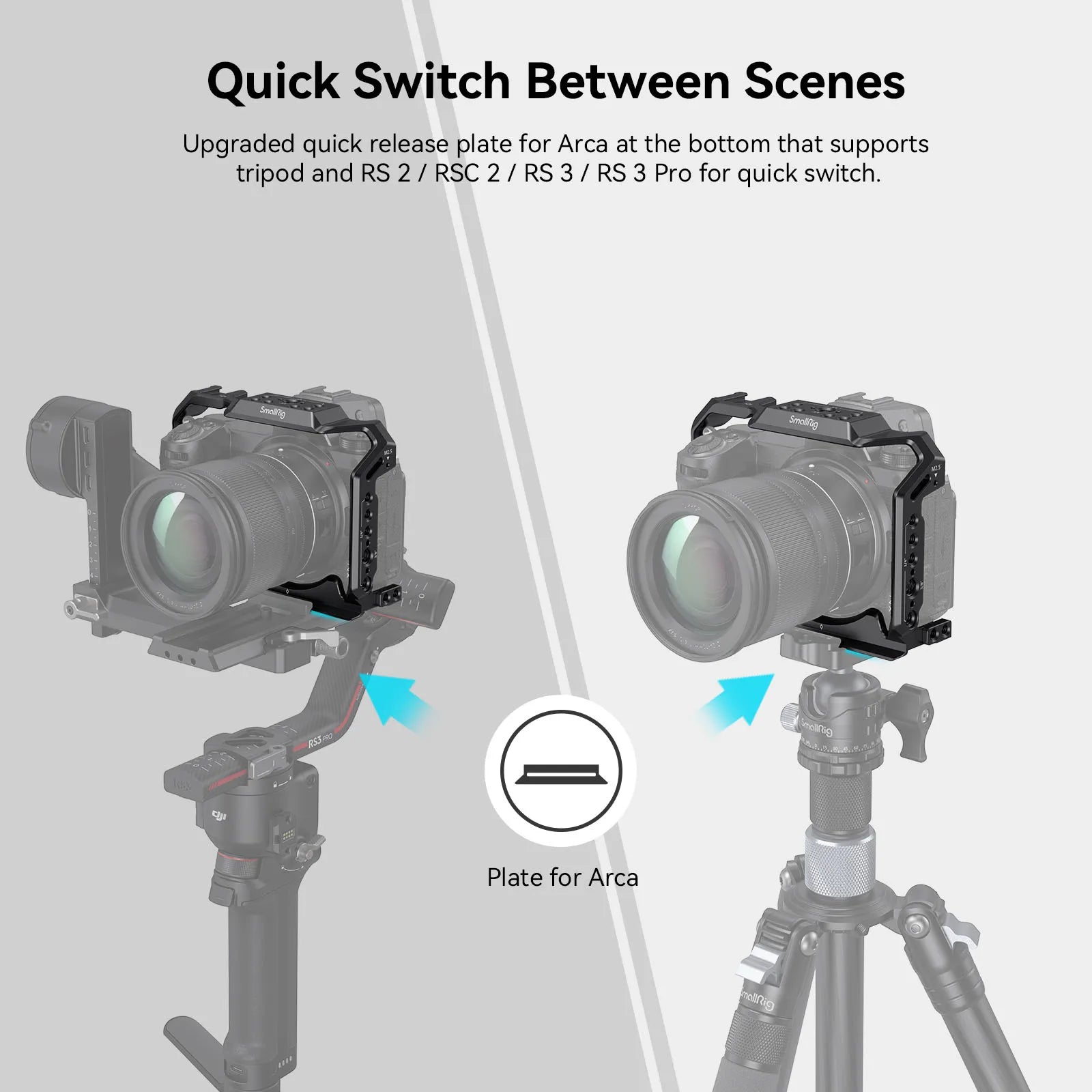 4. Arca-Swiss quick-release plate supports Arca-type tripods and DJI RS 2/ RSC 2 / RS 3 / RS 3 Pro gimbals;