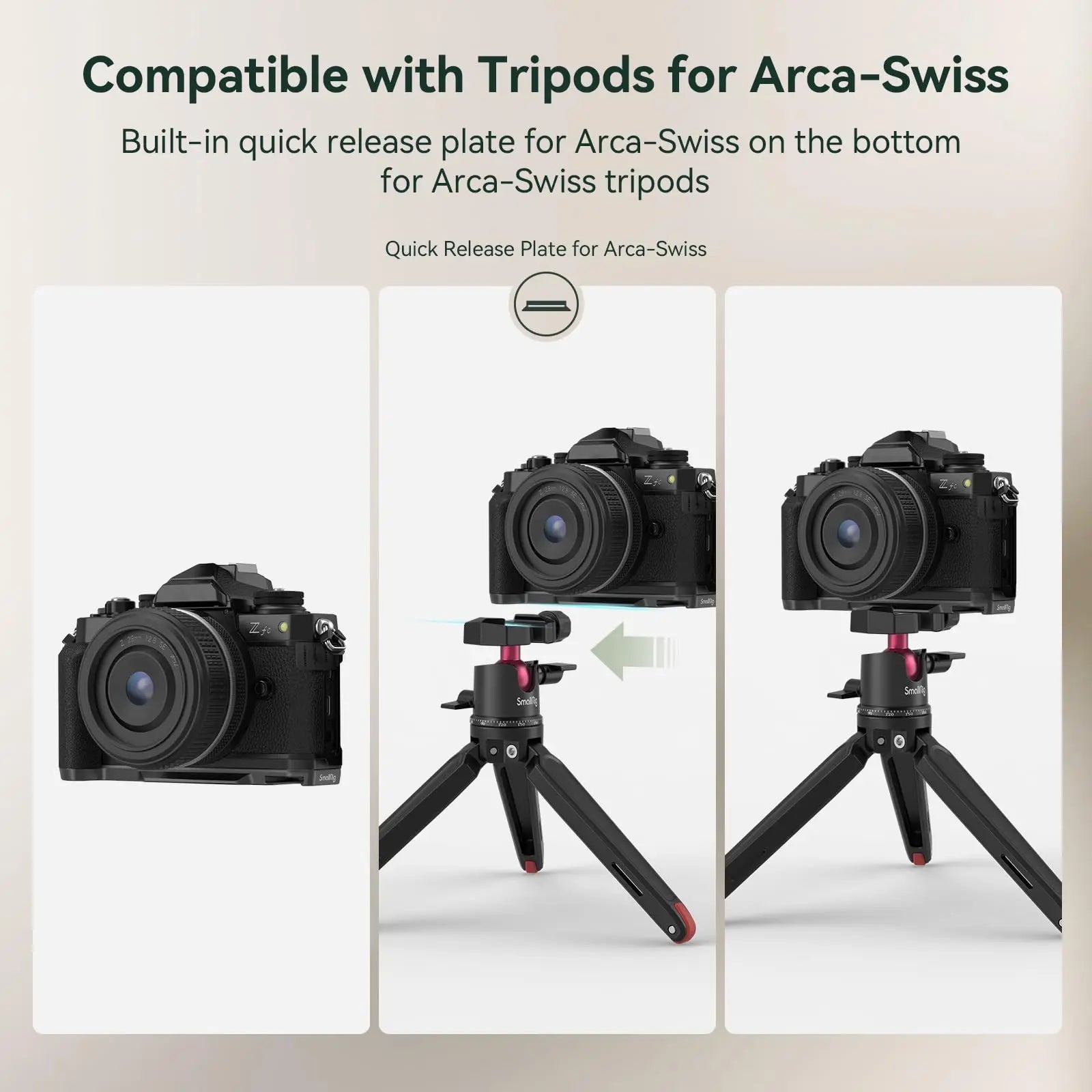 SmallRig L-Shape Grip for Nikon Z fc (Black) 4263 is designed to provide a comfort grip. The retro-style grip shares similar texture and color with the camera; the baseplate shares the same color surface treatment with the camera and fits perfectly. The L grip secures to the camera via a 1/4"-20 D-ring screw on the bottom and comes with a built-in 1/4"-20 threaded hole on the grip that enables vertical shooting on a tripod. The baseplate features a built-in Arca Swiss plate to quickly switch to tripod shooting, and a 1/4"-20 threaded hole at the center that supports tripod or Manfrotto quick release plate. In addition, the baseplate features a built-in cold shoe allows attaching microphone, light and other accessories; the plate also comes with a slot for wrist strap. The grip adopts compact and lightweight design, which is easy to carry around.