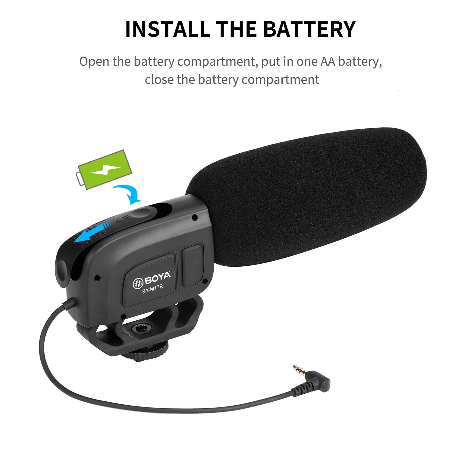 The BY-M17R is a limited-budget super-cardioid shotgun microphone , which is specially designed for DSLRS , camcorders and audio recorders. With it's good quality and super-cardioid polar pattern , it could be widely used in daily recordings , such as video shooting , vlogging , podcasting and more.
