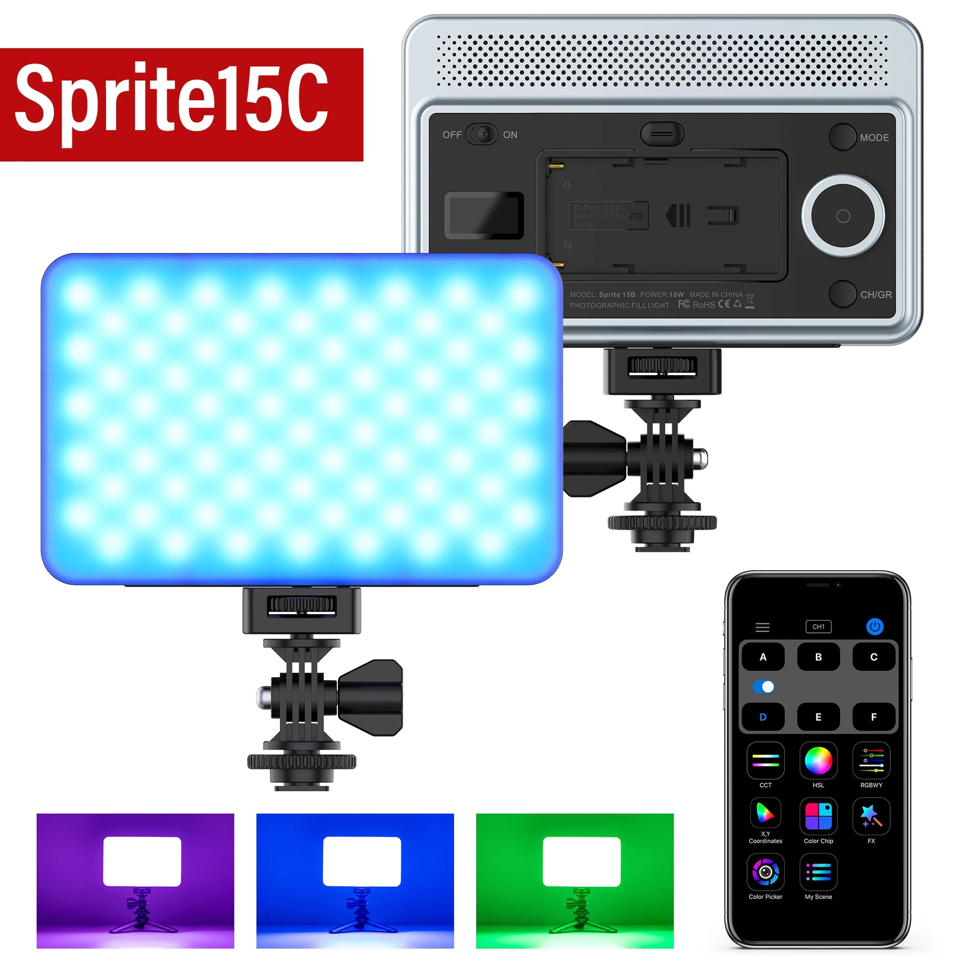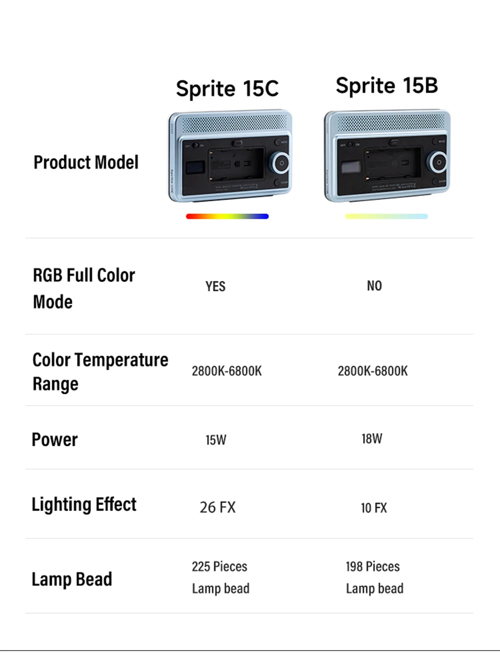Sprite 15C has RGB full color mode, 36,000 colors with a wide color temperature of 2800K-6800K, integrated soft light mask, and 1% stepless brightness adjustment, all of which can help interpret the world. Support APP wireless control,26 kinds of scene light effect and other functions, easily display myriad creative.