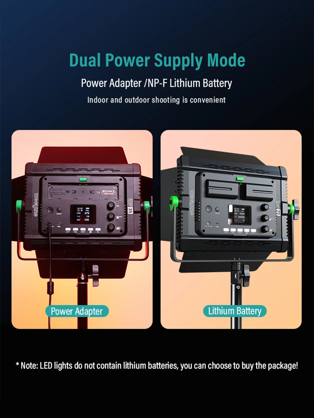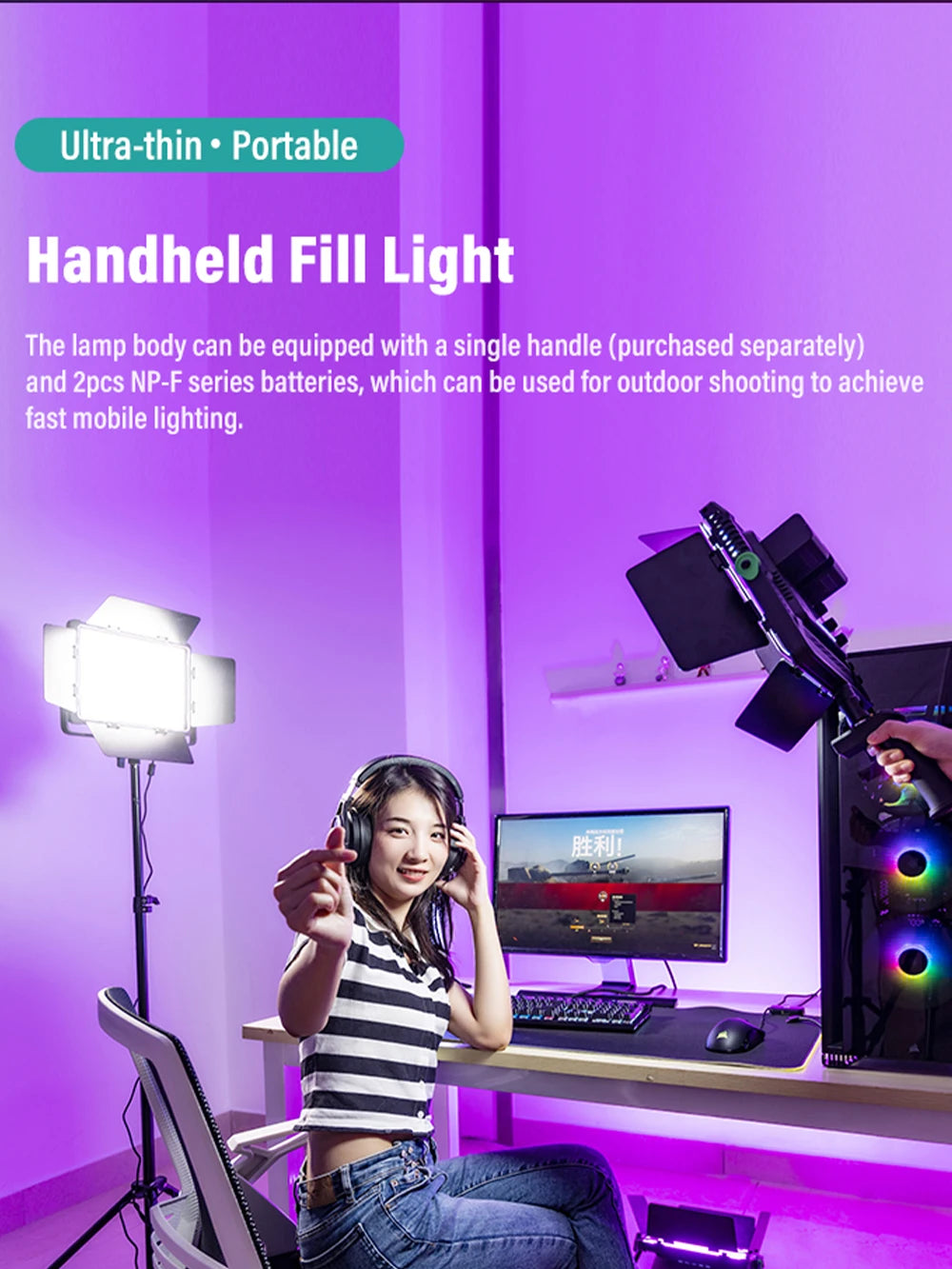 The lamp body can be equipped with a single handle (purchased separately) and 2pcs NP-F series batteries, which can be used for outdoor shooting to achieve fast mobile lighting.