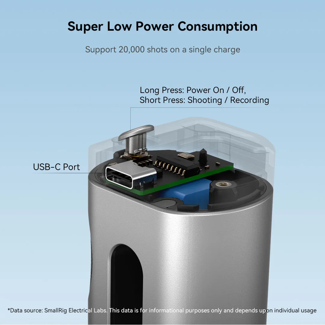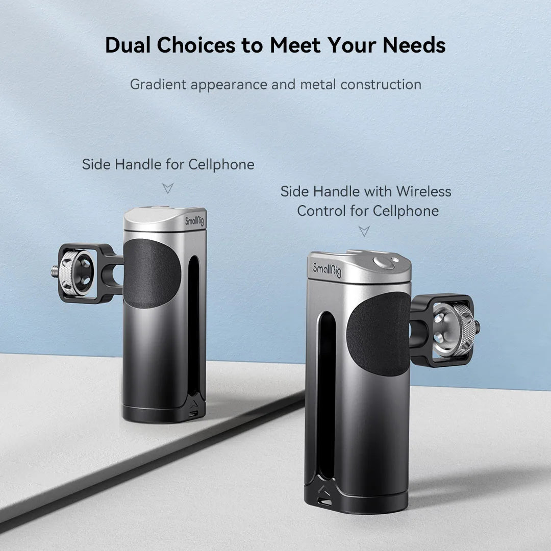 SmallRig Side Handle with Wireless Control for Cellphone 3838, comes with a built-in rechargeable wireless remote control module, supports to control the camera of most Android and Apple smartphones to start or stop the recording, thus improving shooting efficiency and experience. Features a cold shoe mount on the top of the handle for attaching microphone or LED light for more professional shooting. The handle can be used on the left or right hand by adjusting the handle connector also can be moved up and down according to the center of gravity and position of accessories for a better grip experience. The surface of the handle is made of aluminum alloy with gradient anodizing, which makes it durable and visually impressive. Also, it comes with hole at the bottom for attaching hand strap to prevent accidental falling during shooting.
