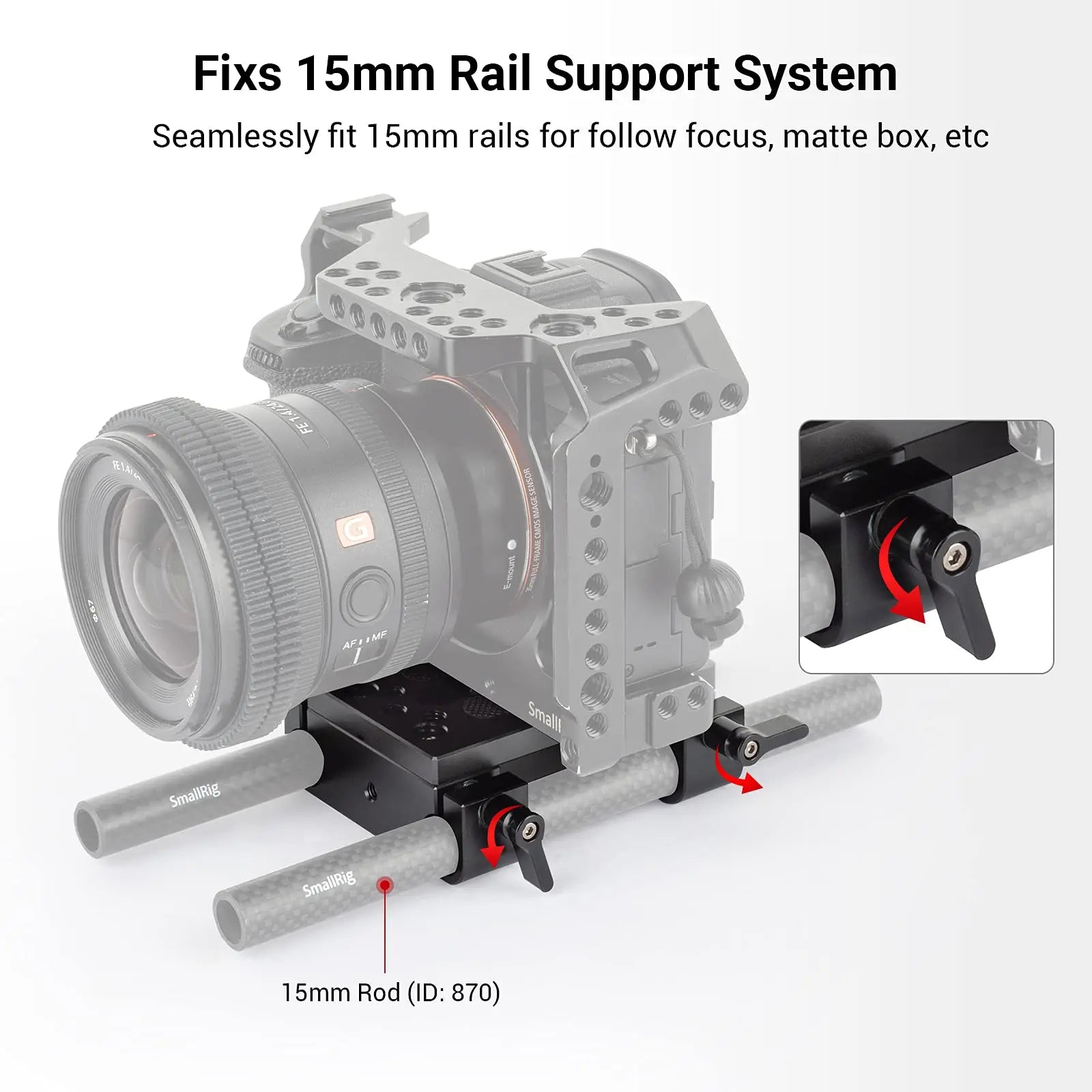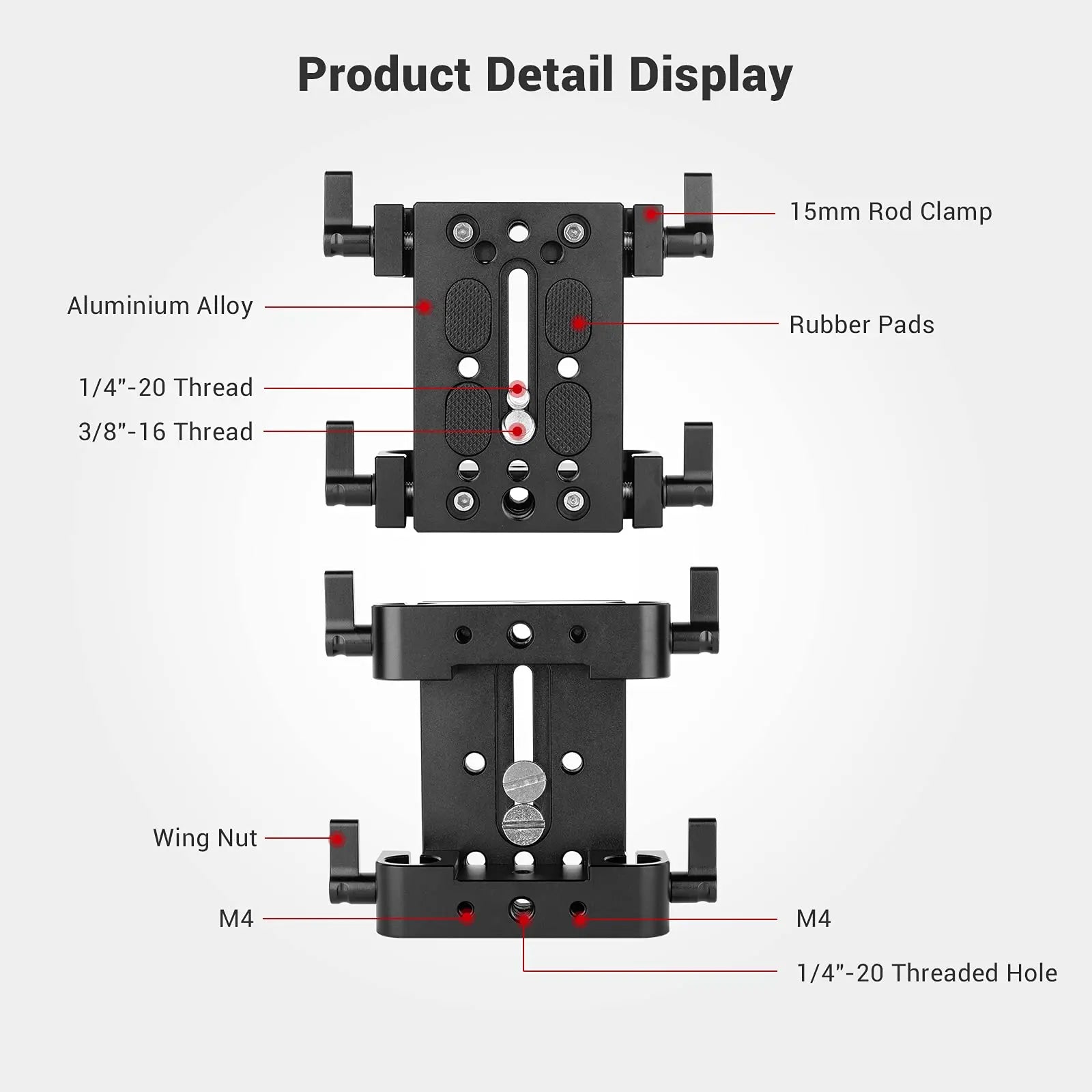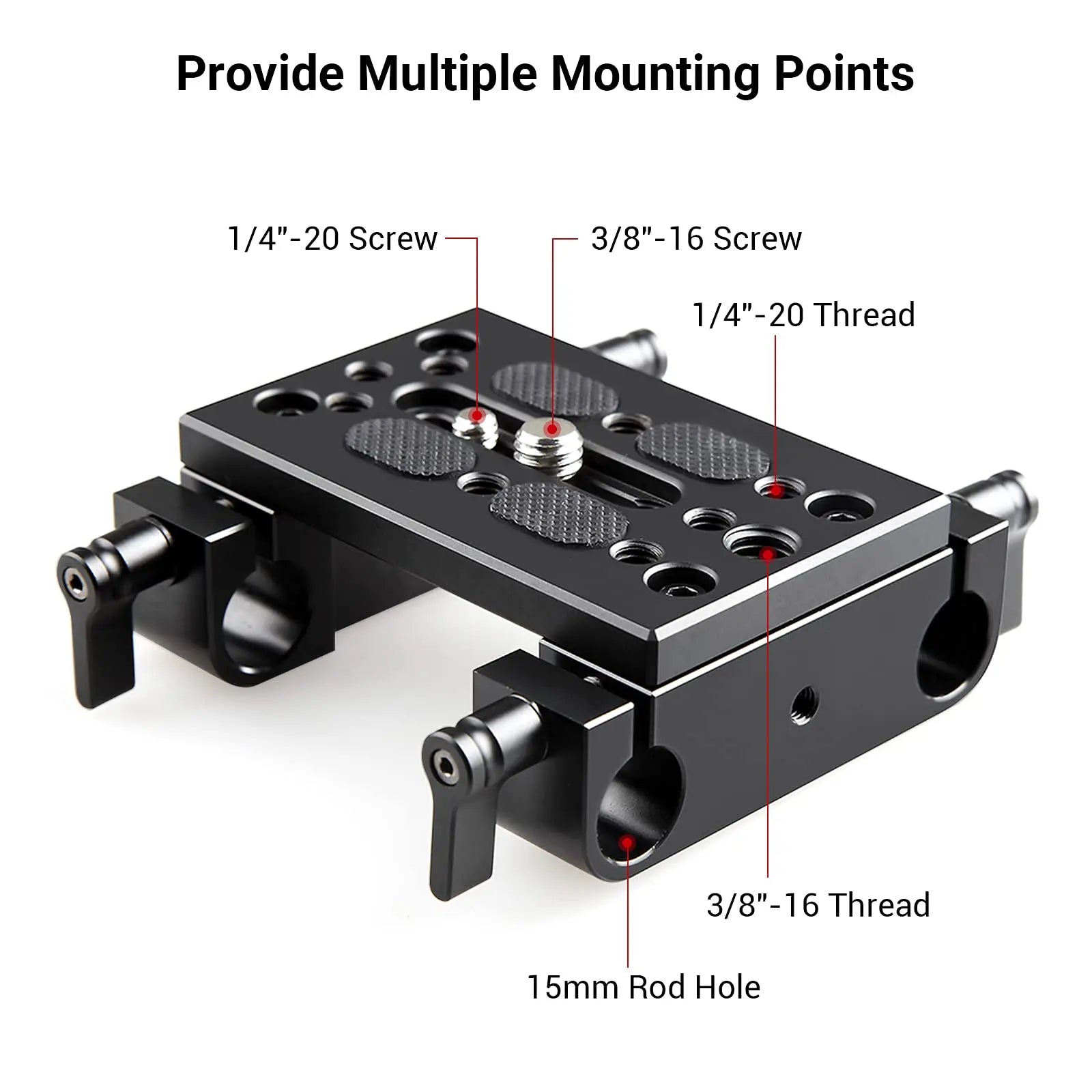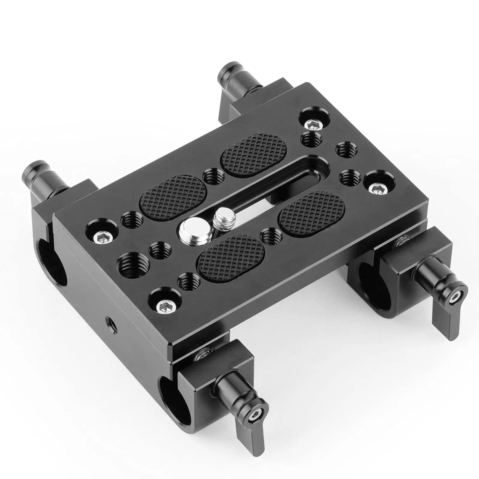 SmallRig Mounting Plate with 15mm Rod Clamps 1775 is an aluminum plate with 15mm rod clamps for camera mounting, which provides protective and stable mounting options to camera devices.