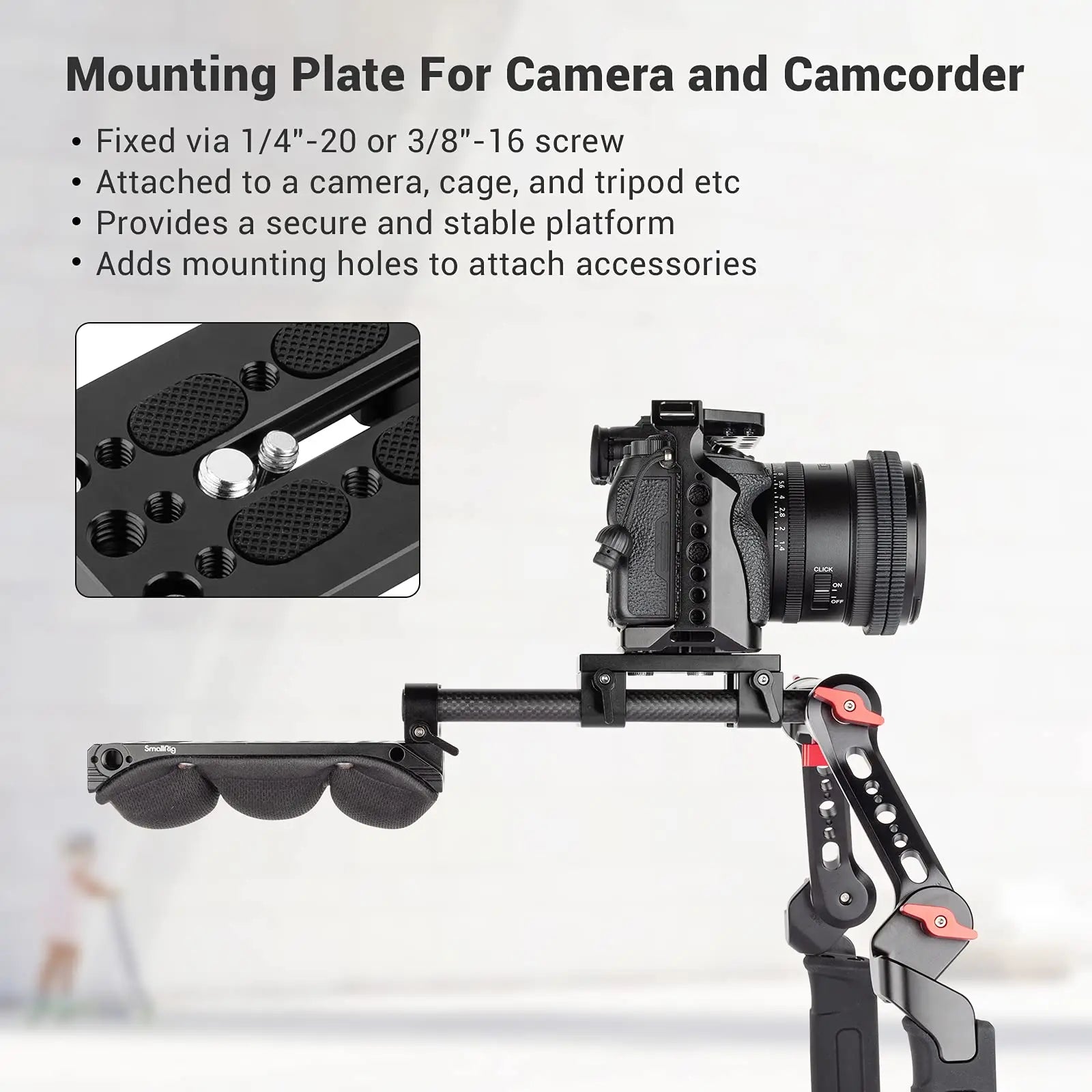 The camera could be slid and adjusted along the middle groove, and accessories can be mounted via the 1/4’’ and 3/8'' threaded holes. There are screws and rubber cushions for camera attachment and protection. It could be used to directly mount a camera, cage, and tripod etc.